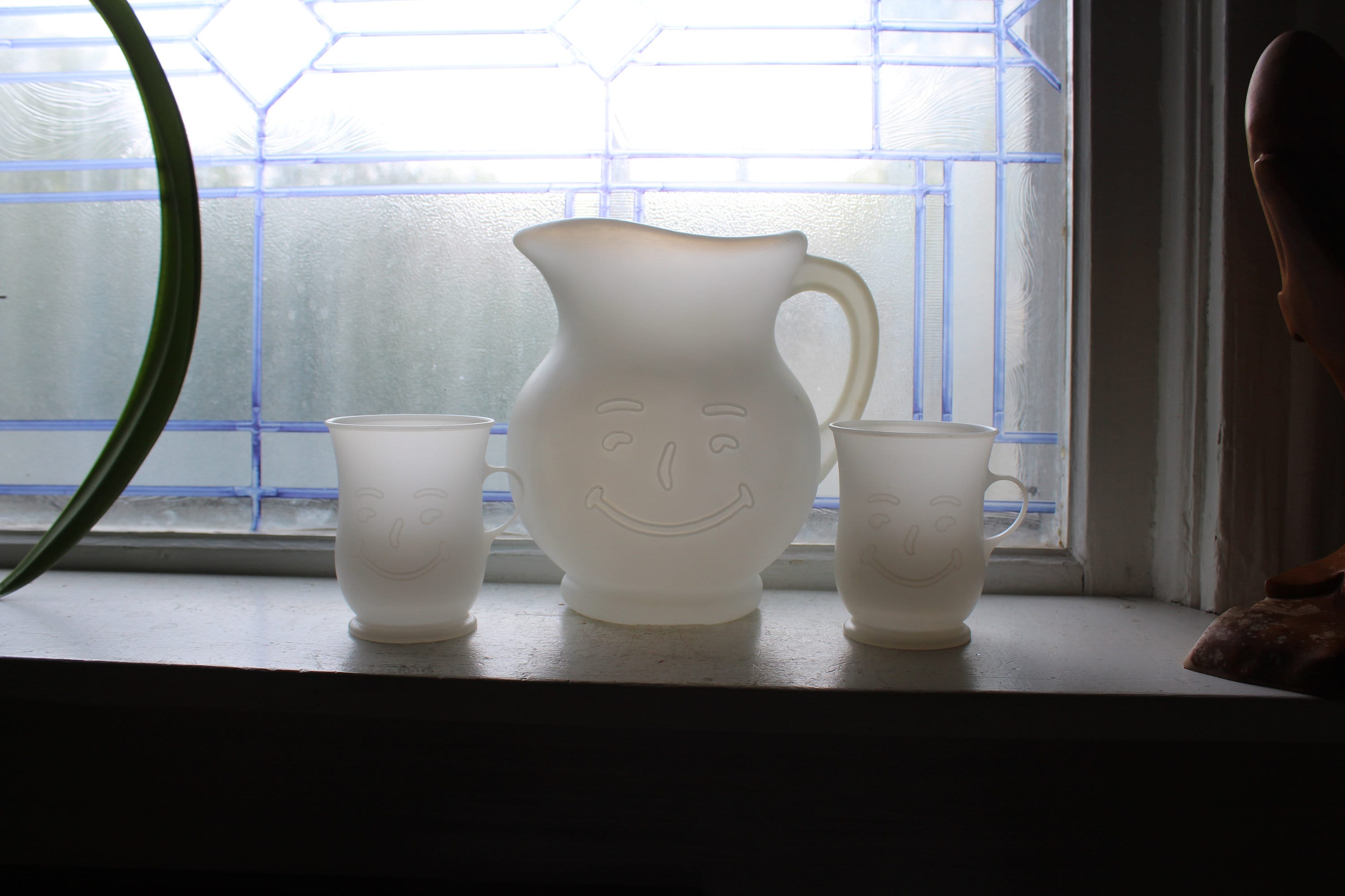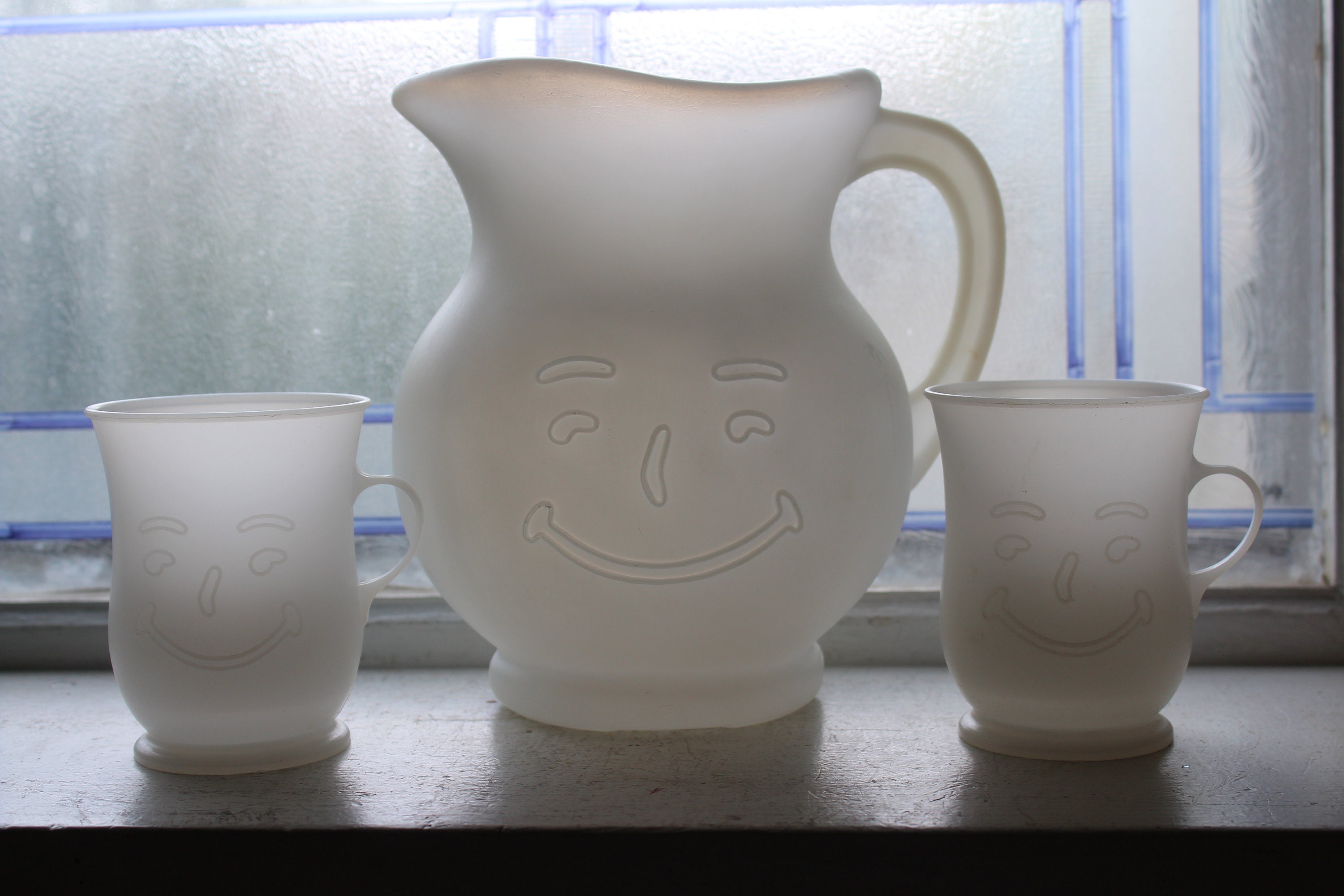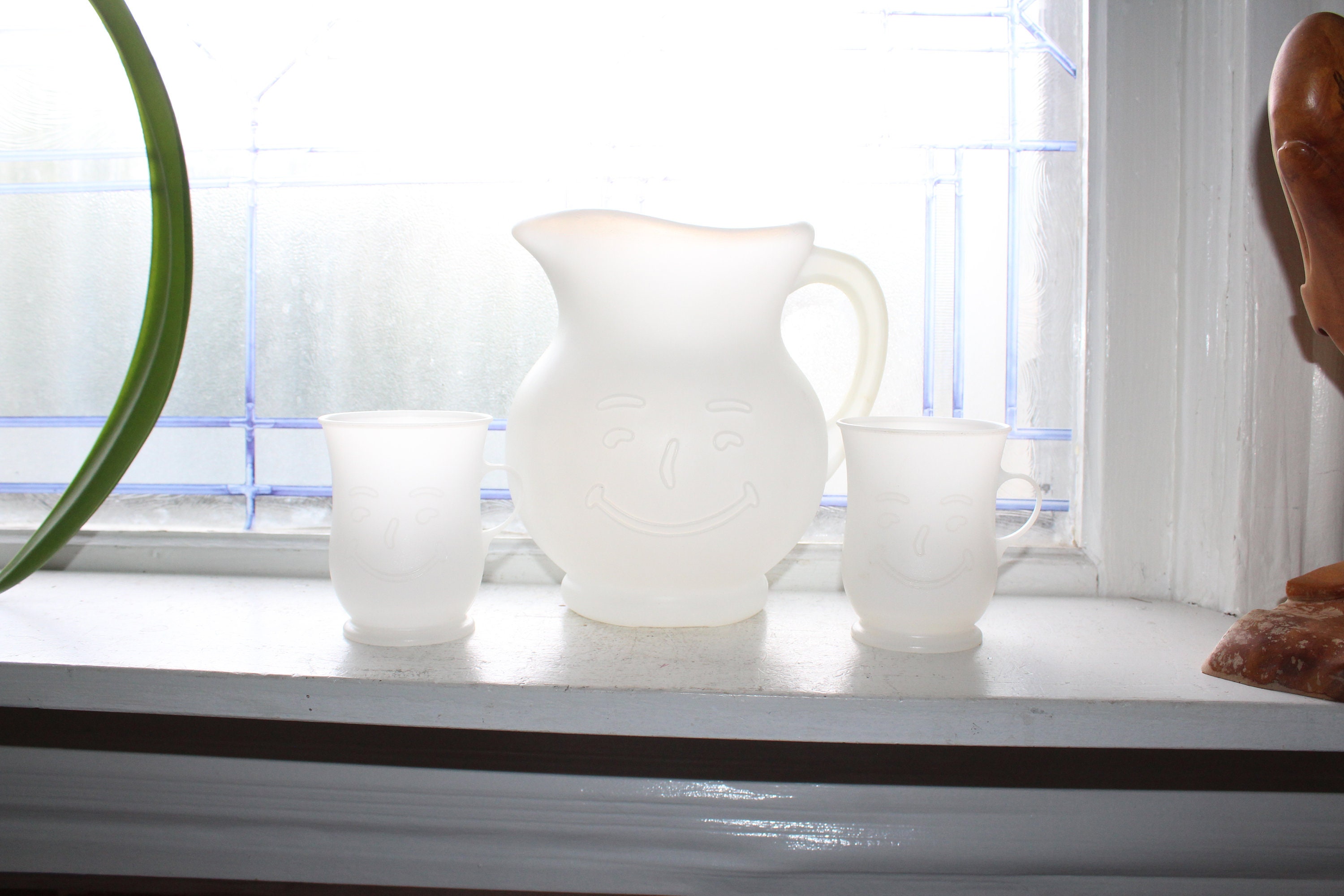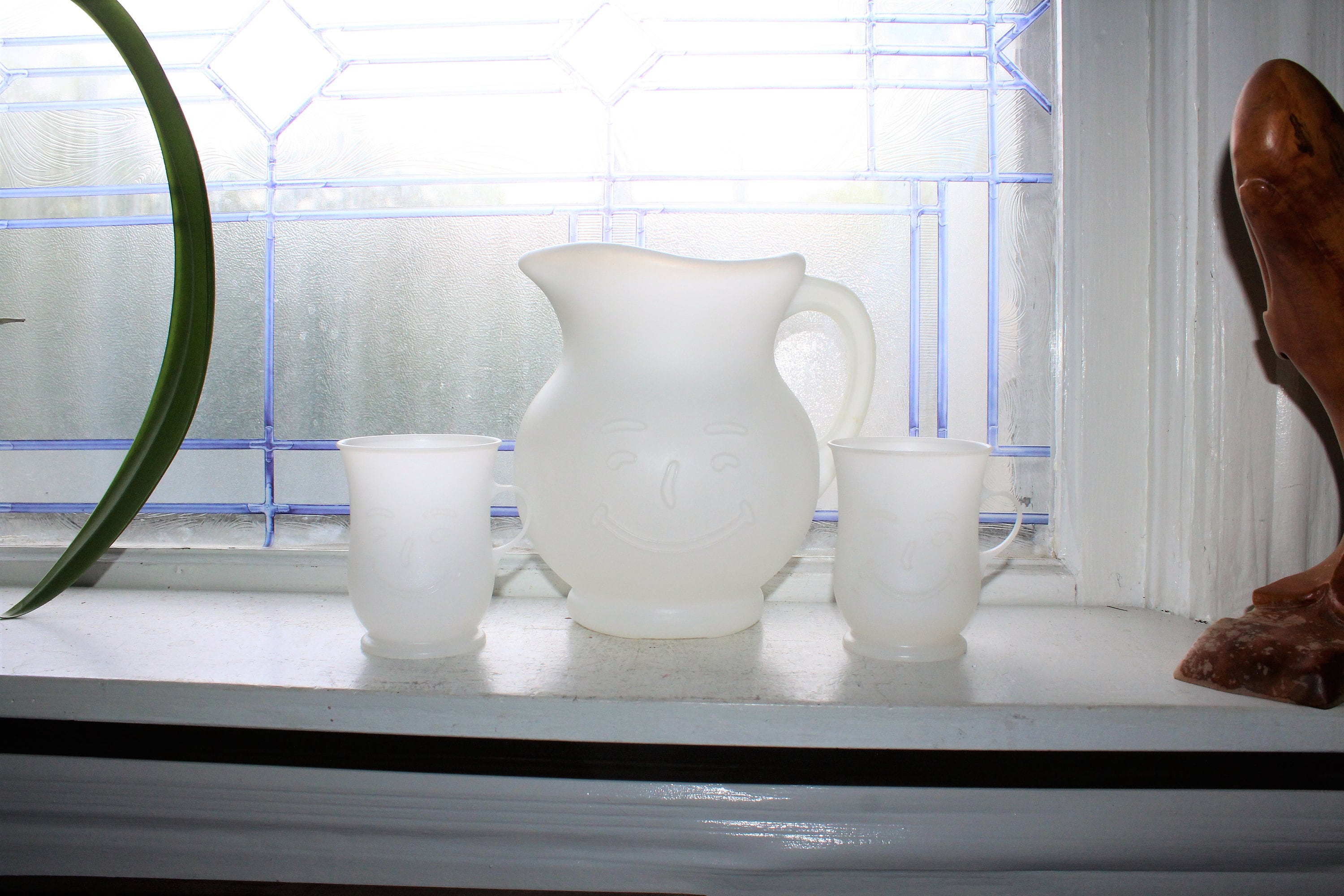 Vintage 1970s white plastic Kool-Aid pitcher and two tumblers with smiley face, in excellent condition. The pitcher measures 7 1/2" high and has no chips or cracks, perfect for use or display. Enjoy!
