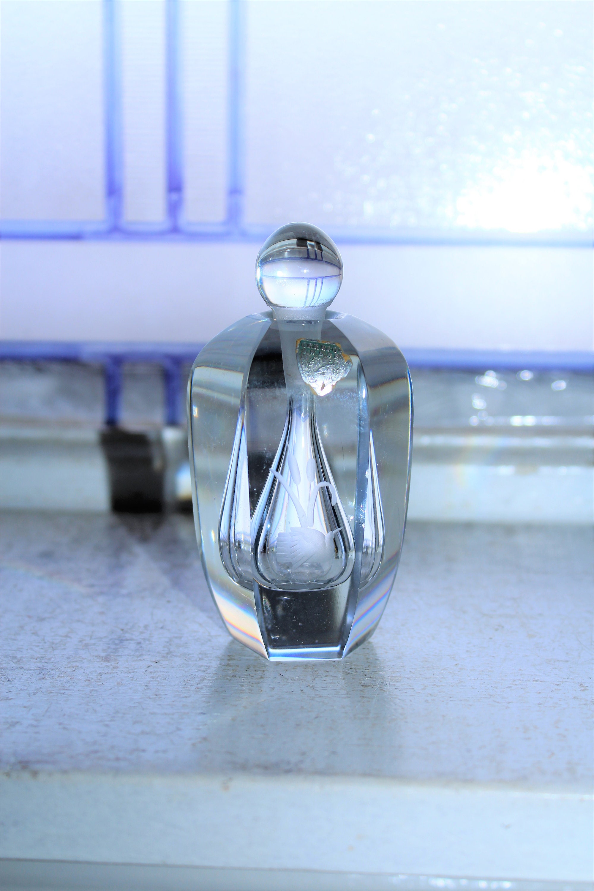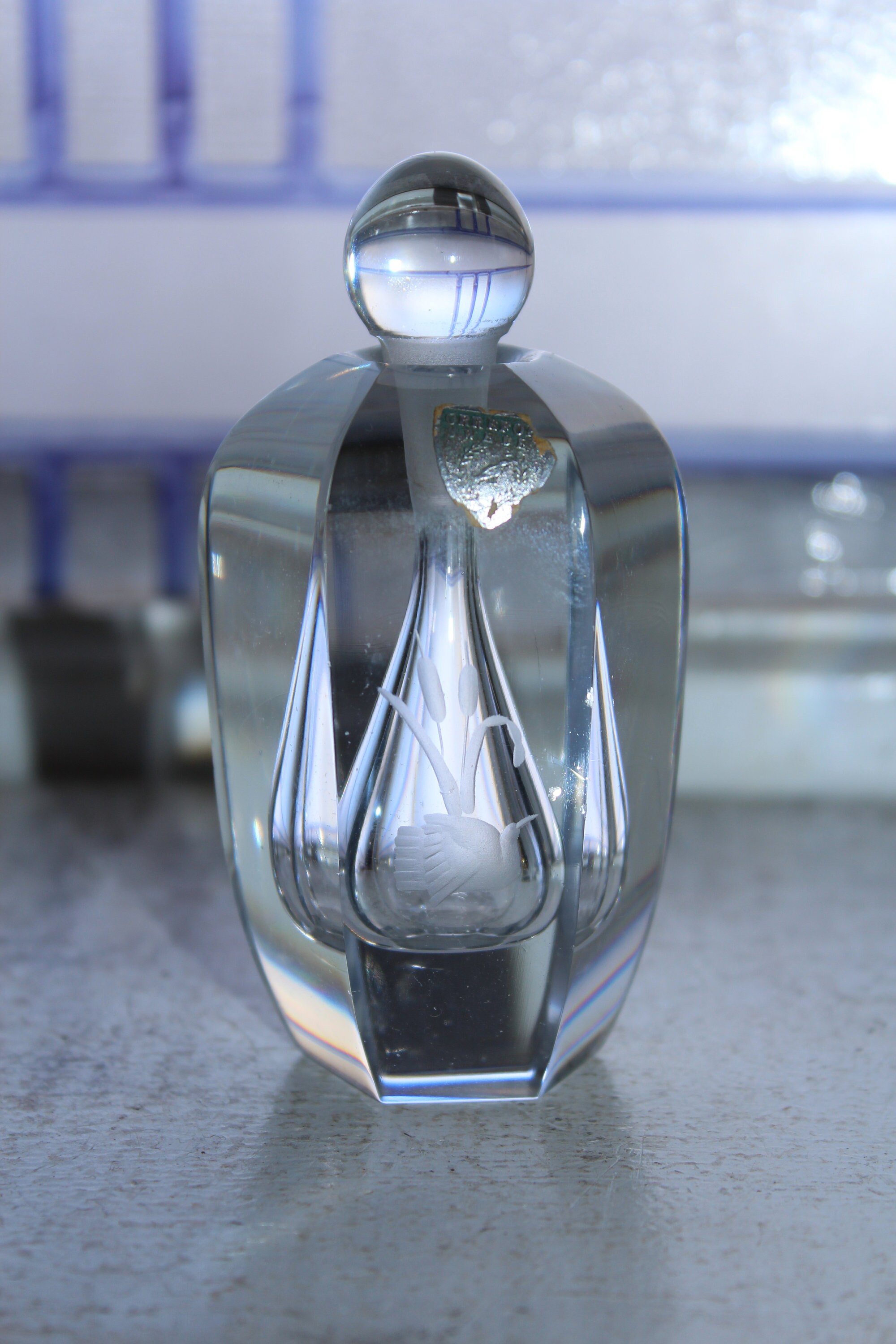 This is a vintage Orrefors of Sweden cut crystal perfume bottle featuring a swan and cattails, in excellent condition. The bottle measures 3 3/4" high. No chips or cracks, displays well and is perfect for display in a bed or bath. Enjoy!