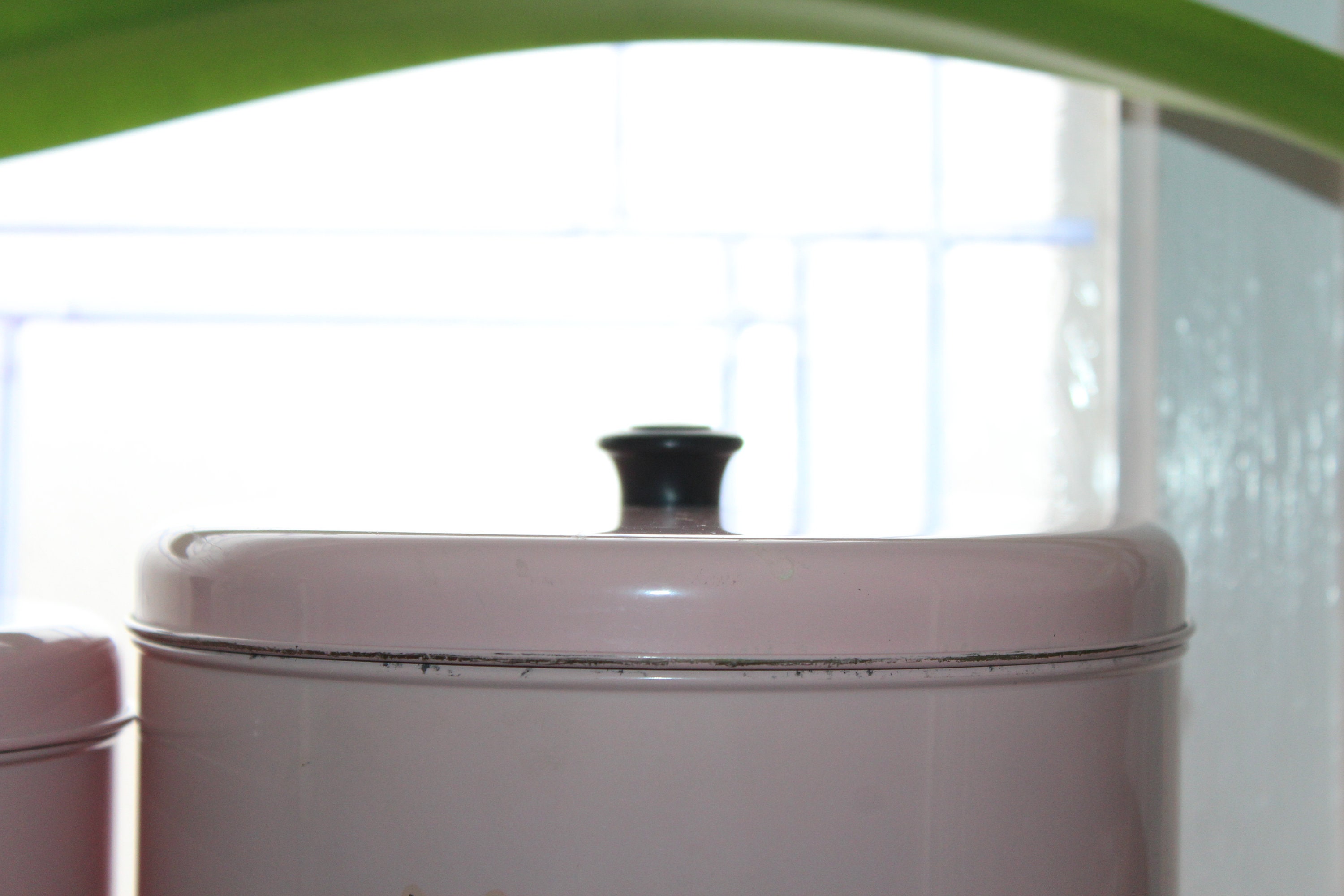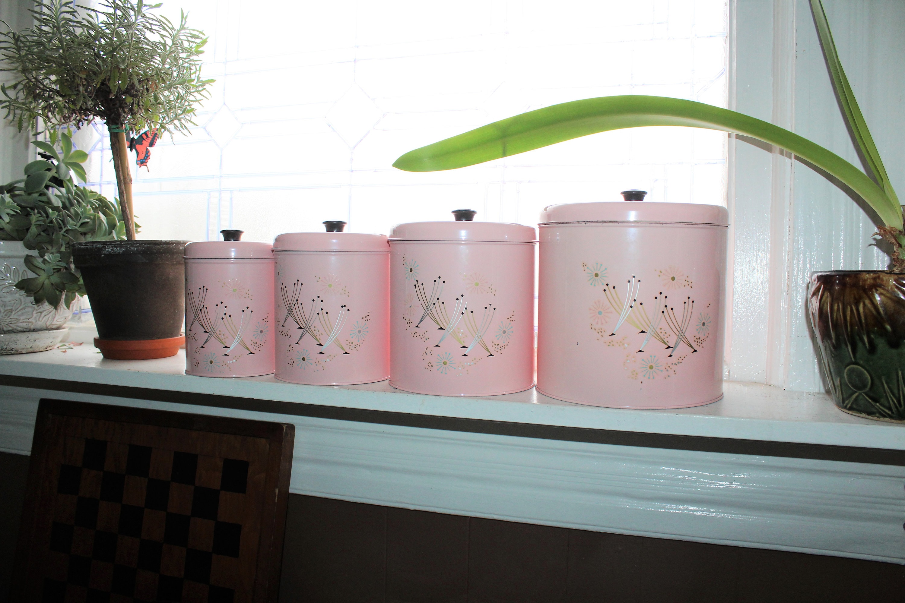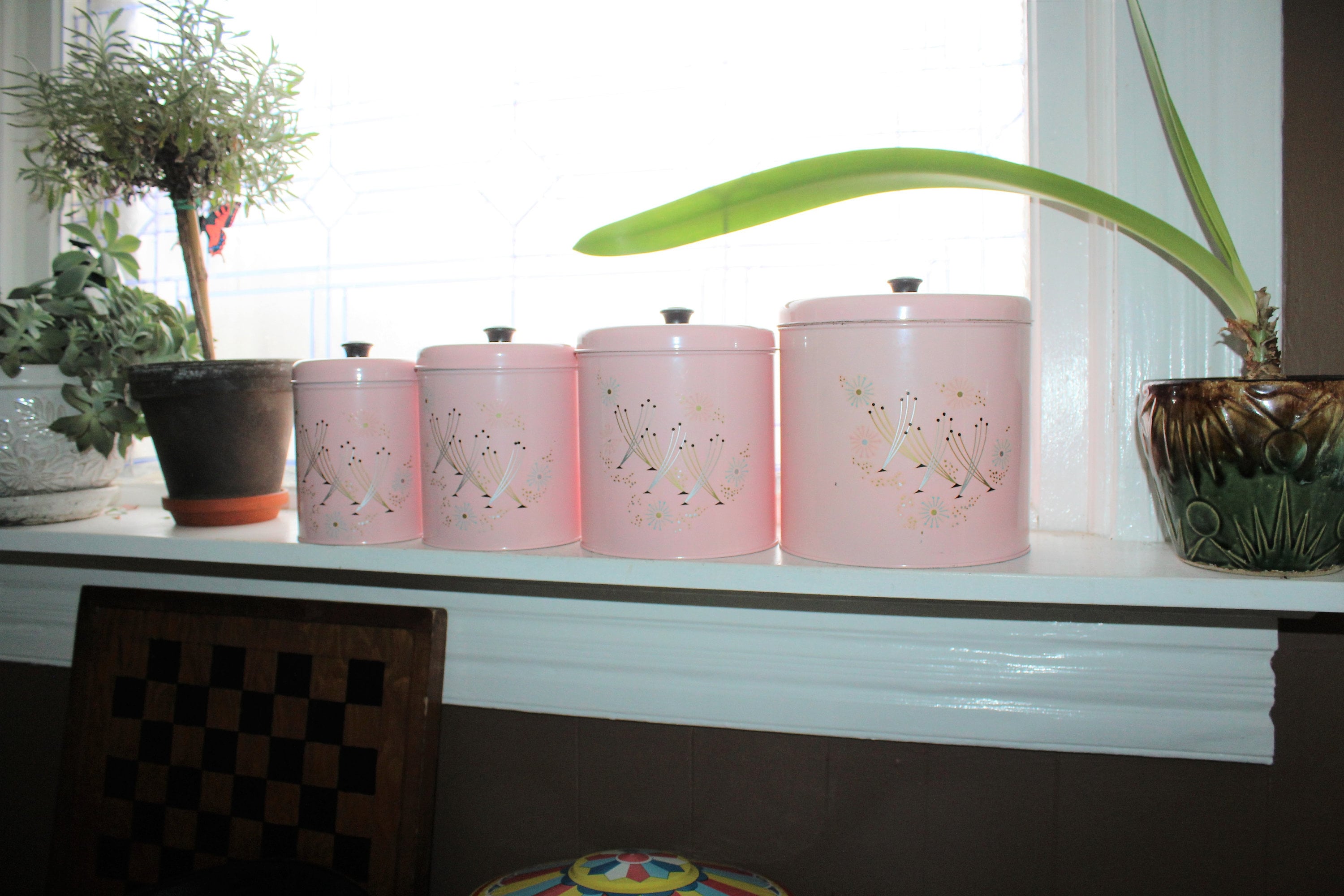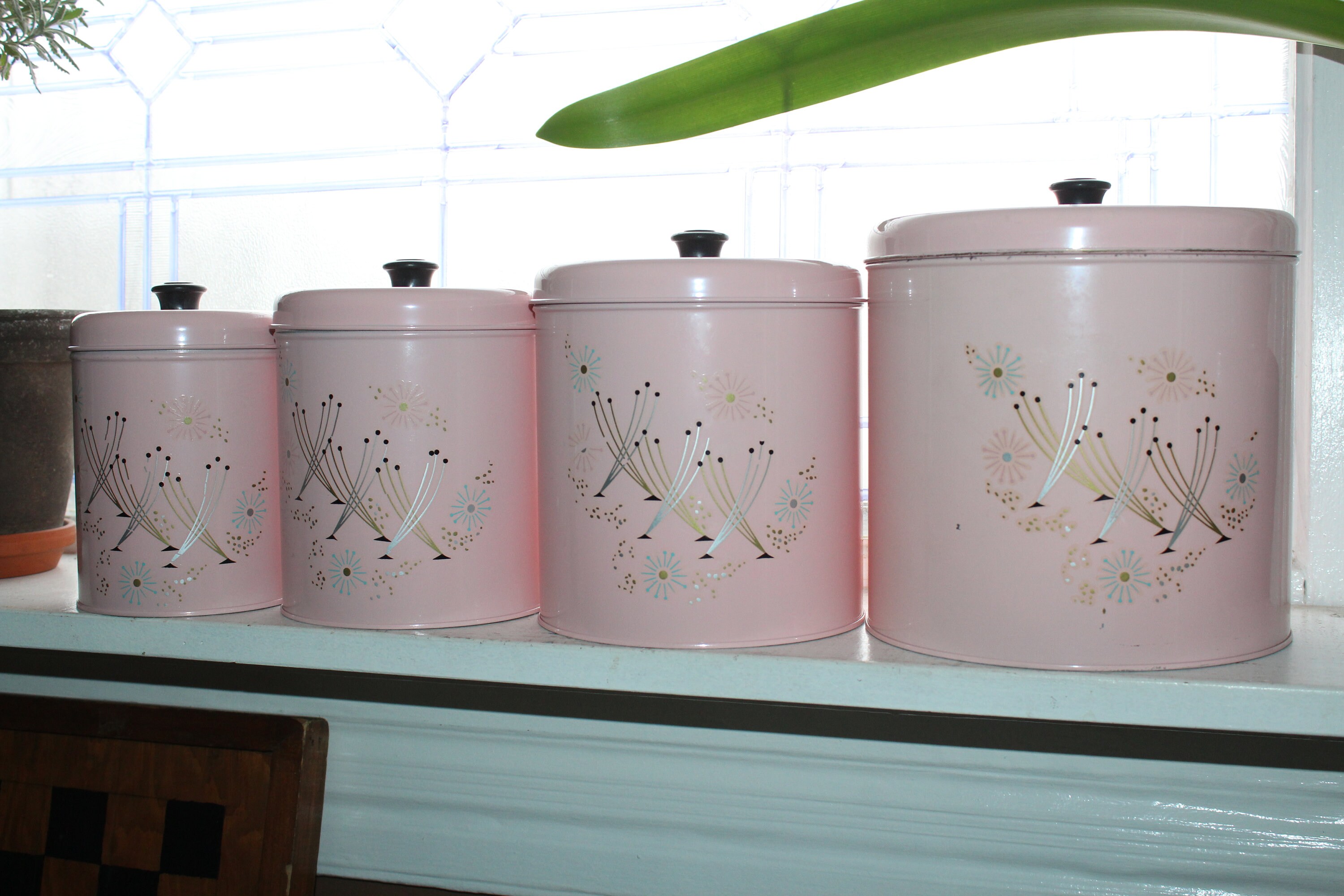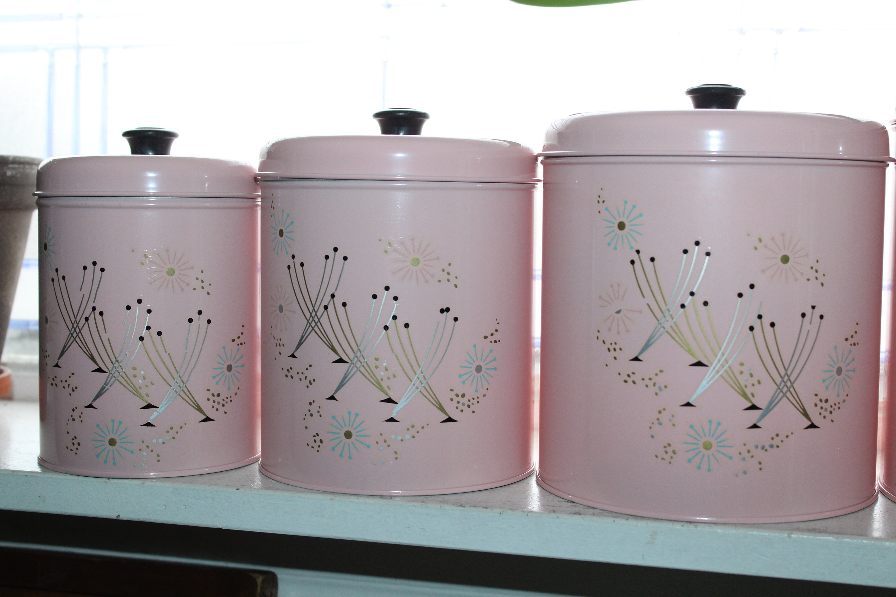 Vintage 1950s Mid Century pink atomic starburst canister set, in very good condition and never been used! In fact, the black knobs for the 3 smallest canisters are still in the original packaging and have never been attached. The largest canister measures 7 1/4" high x 7 1/4" wide. The largest canister has minor wear marks, while the other 3 are excellent. Enjoy!