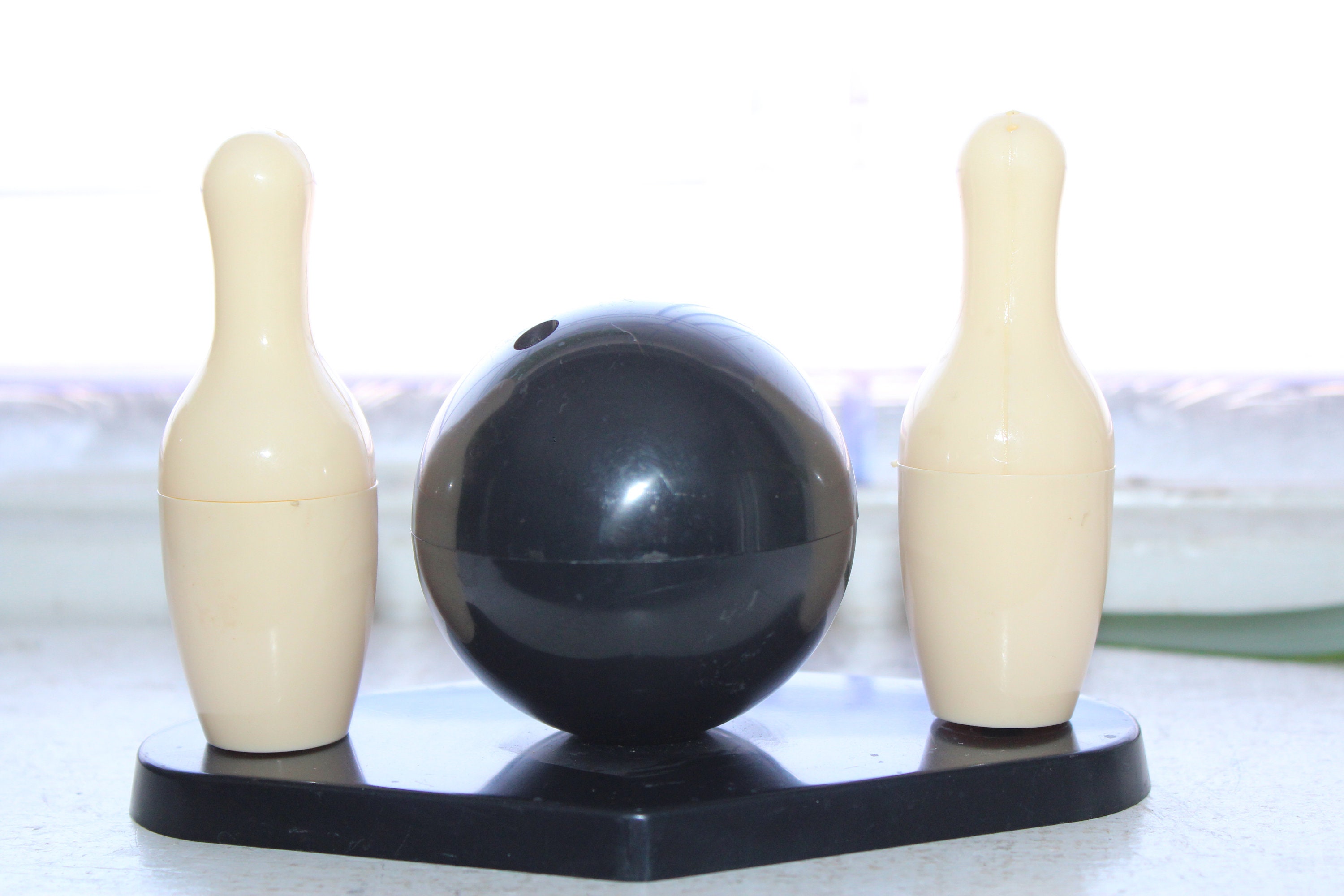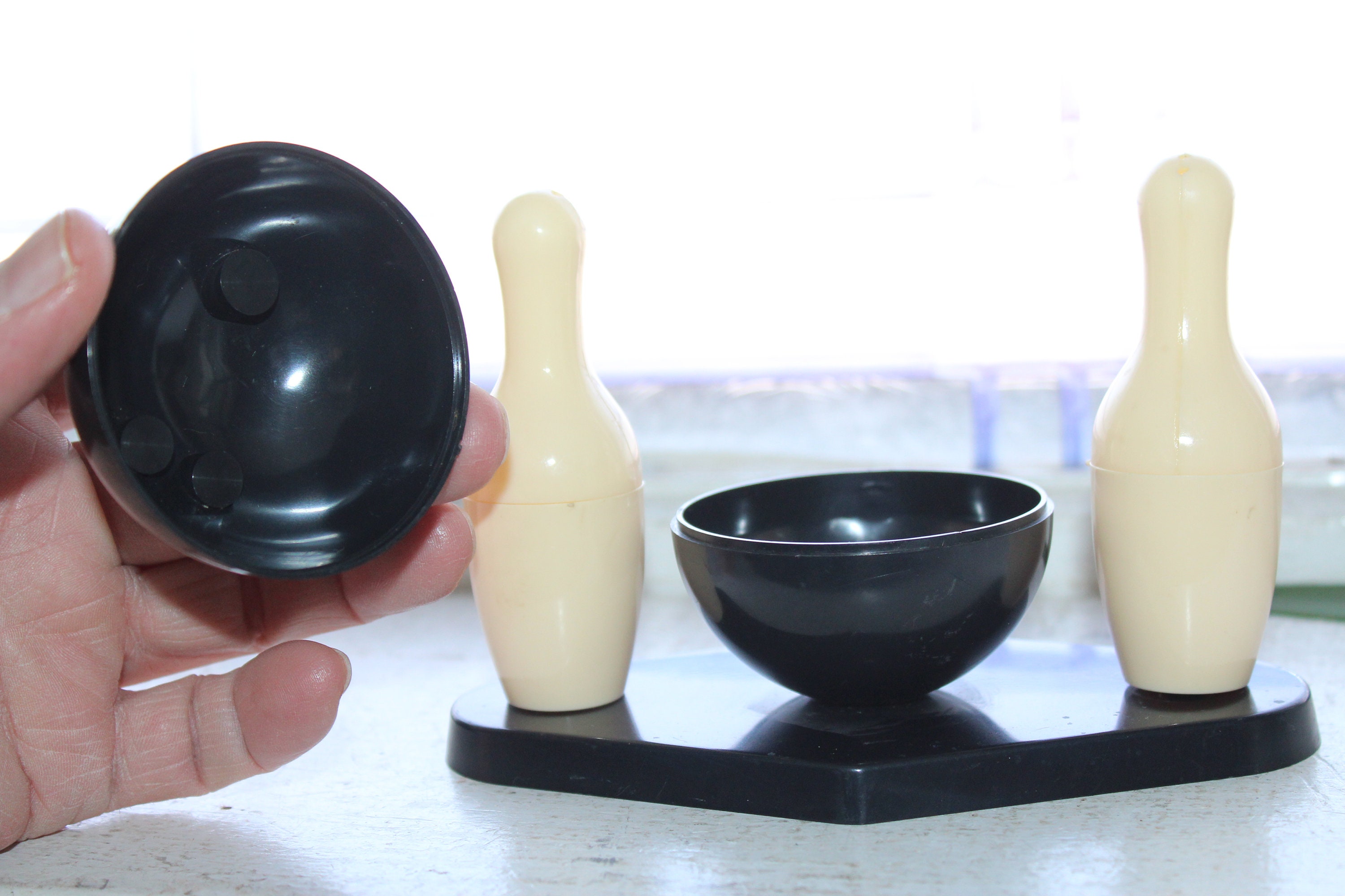 Vintage bowling ball sugar bowl and pins salt and pepper shakers, in good condition. Each pin measures 3 1/2" high and they have no chips or cracks. Enjoy!