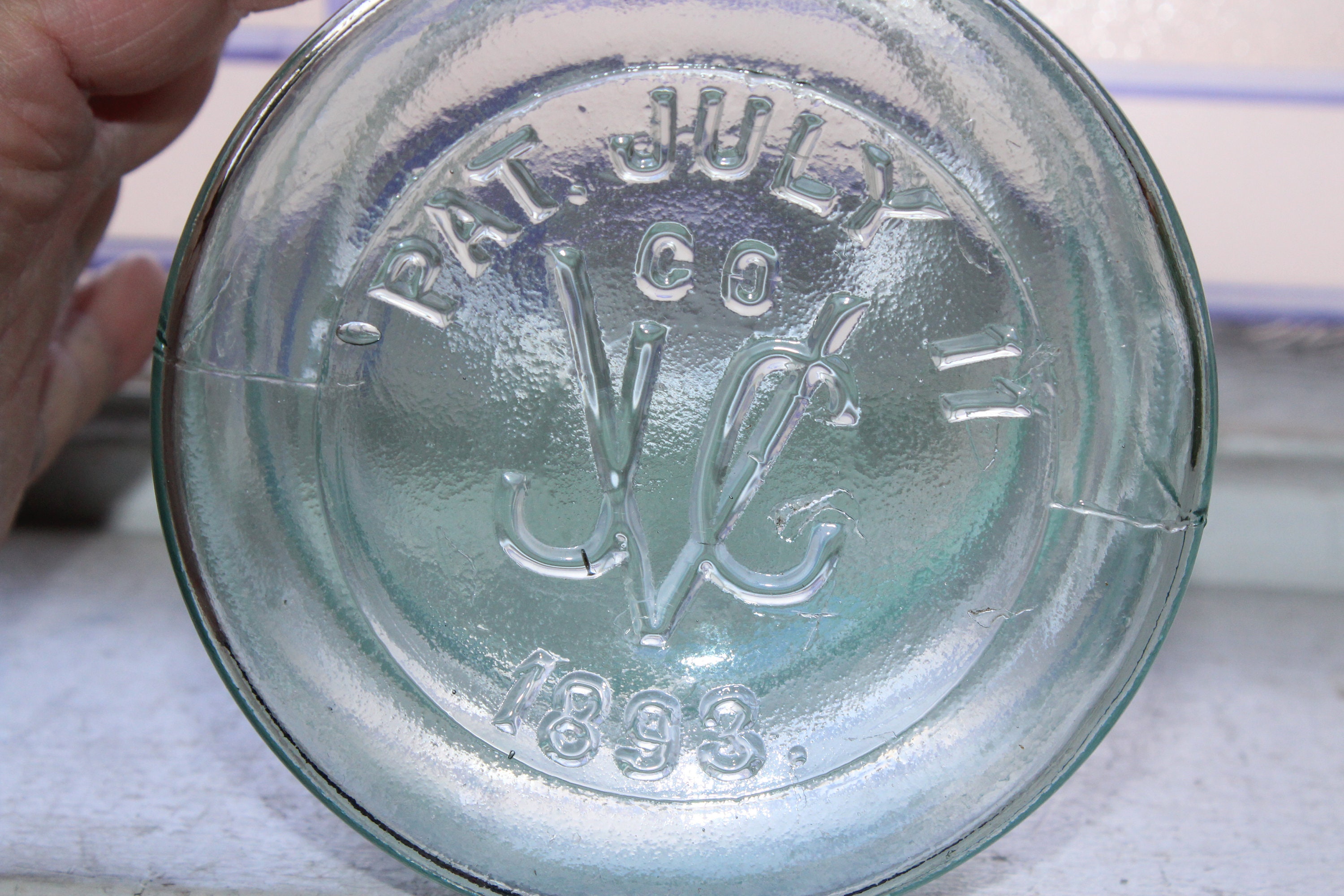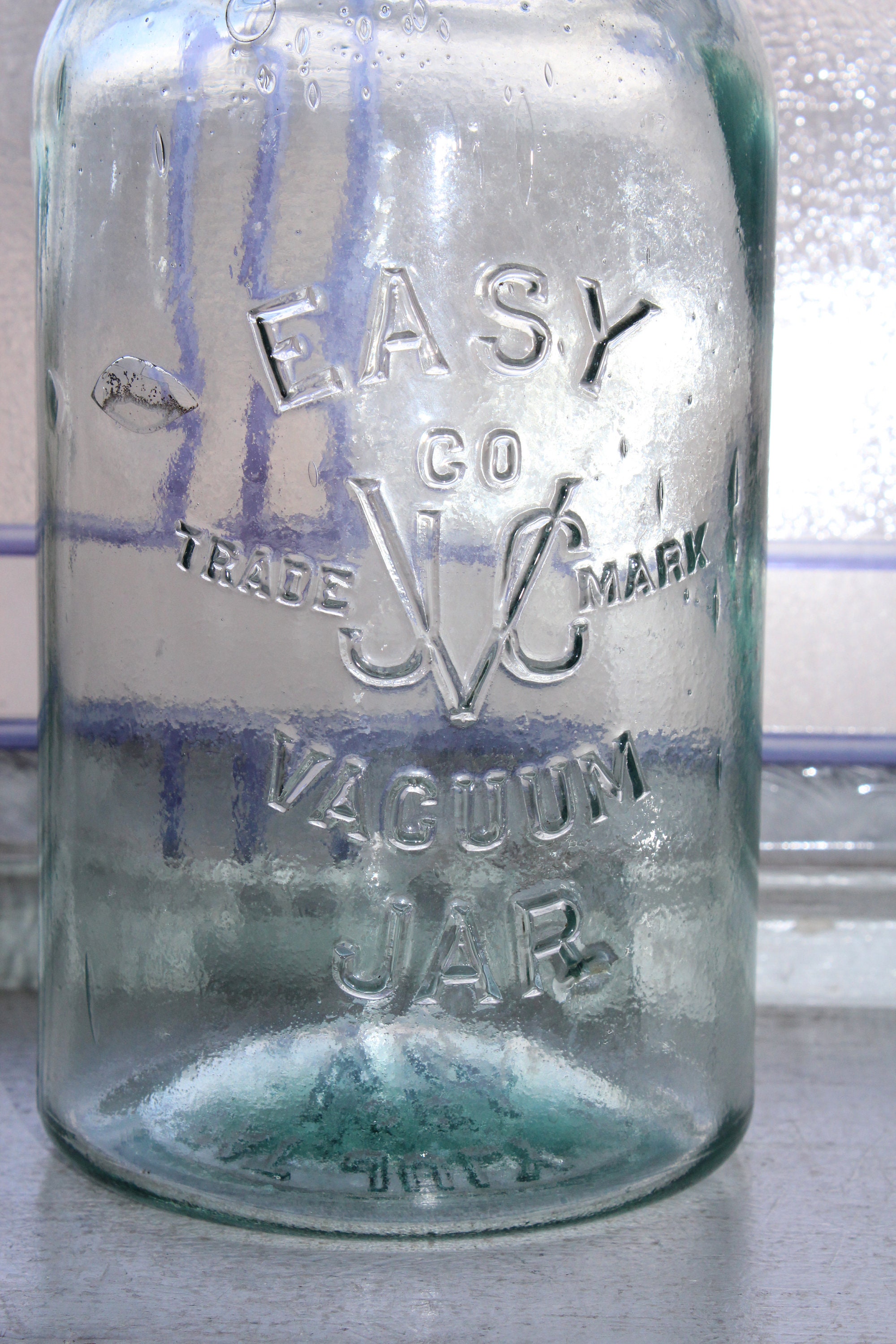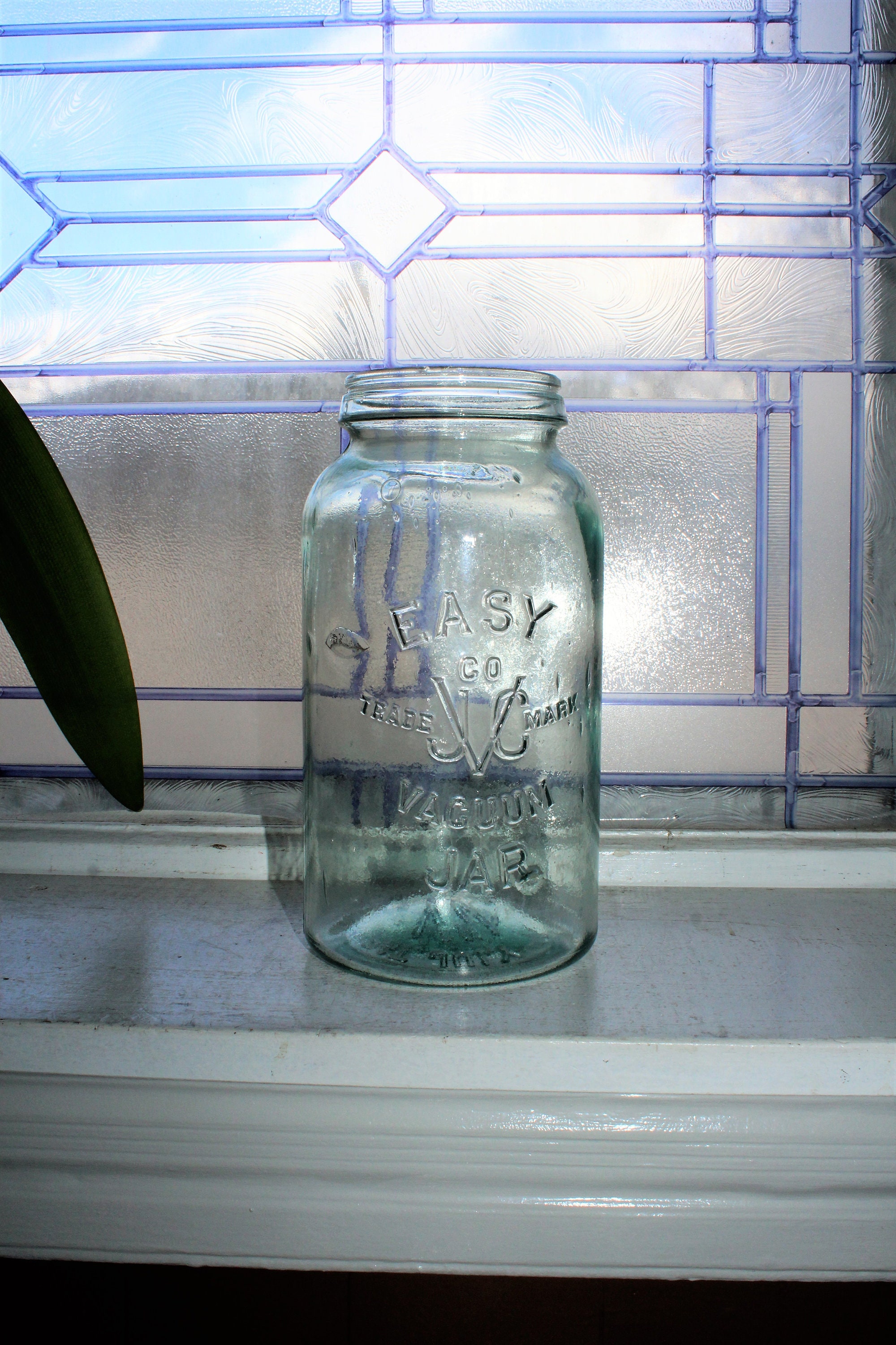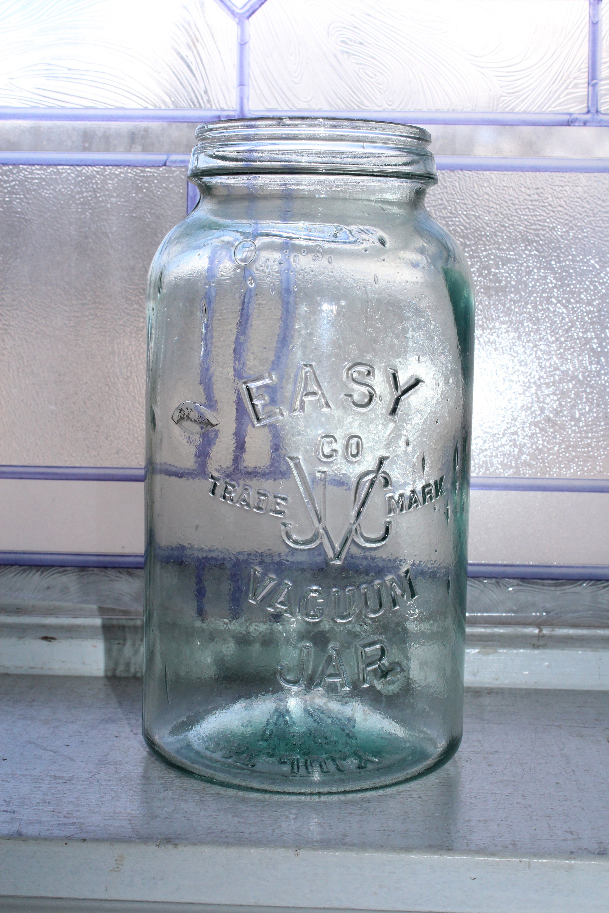 Antique aqua blue glass haf gallon jar, marked Easy Co JVC Trademark Vacuum Jar, in very good condition. The half gallon jar measures 8 1/2" high to the top of the rim. The bottom is marked Pat July 11 1893. No chips or cracks but there is very minor inner rim chipping that is typical for jars of this age. Perfect for a country kitchen, or a wedding decoration. No lid. Enjoy!