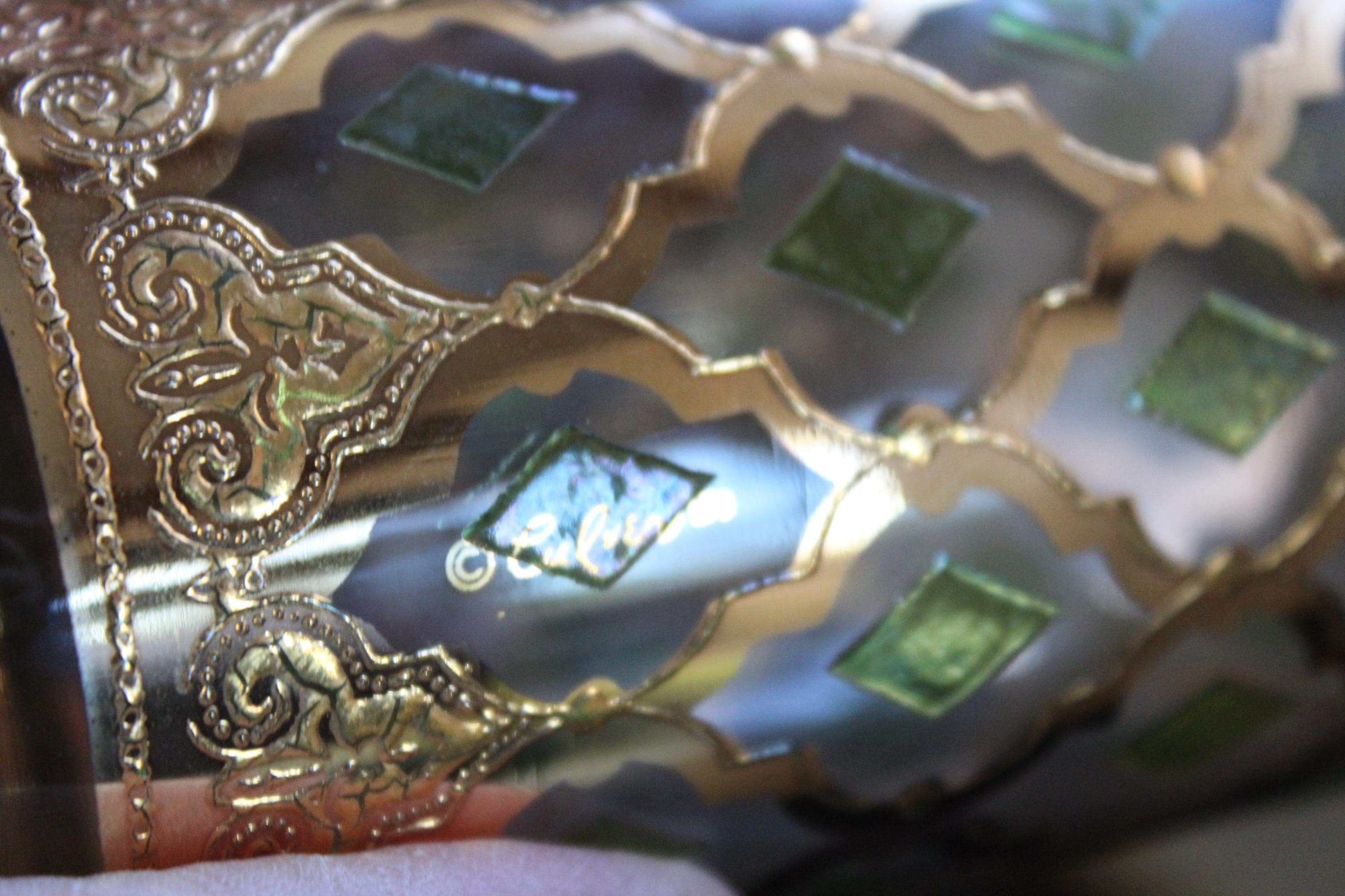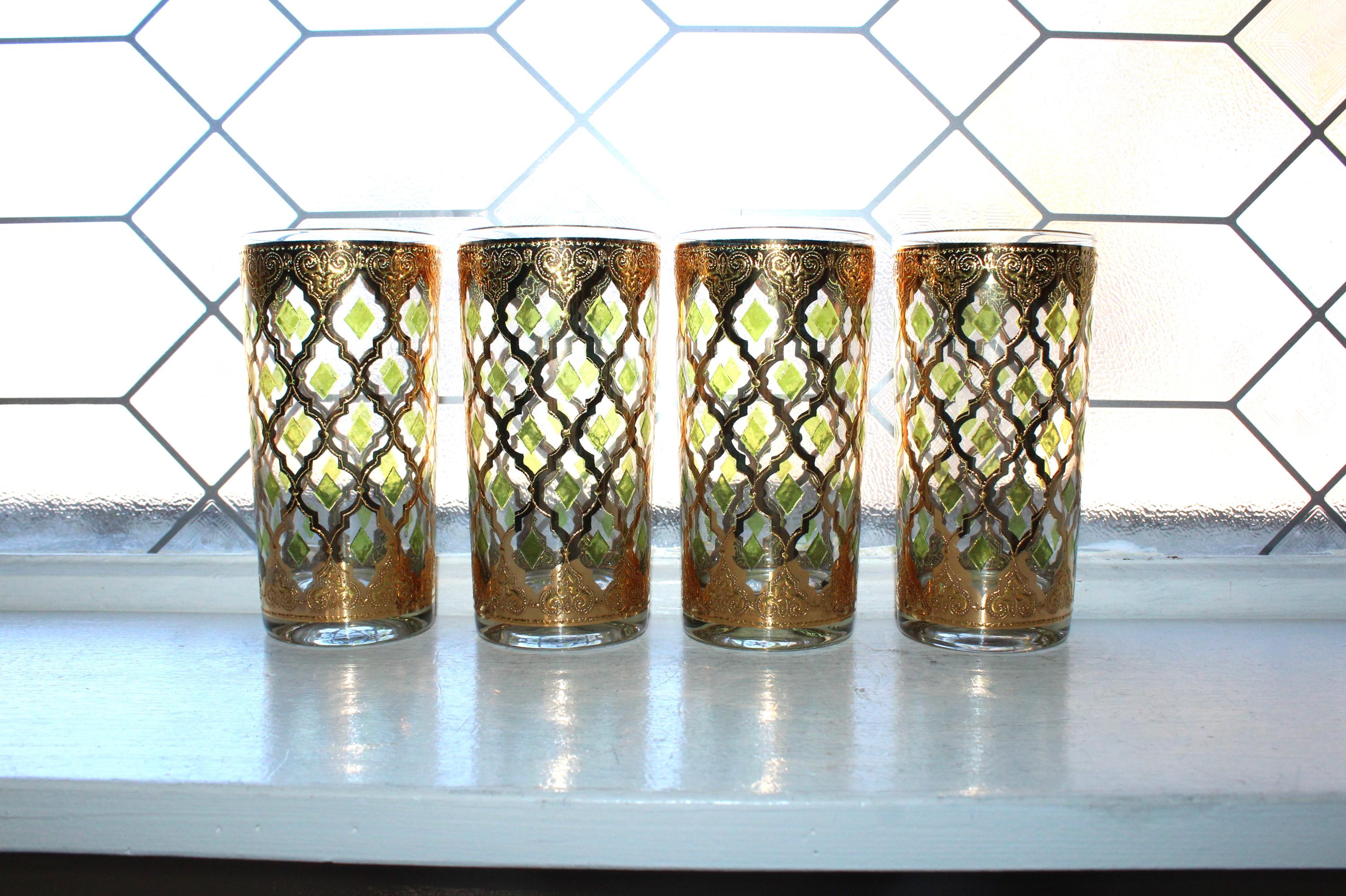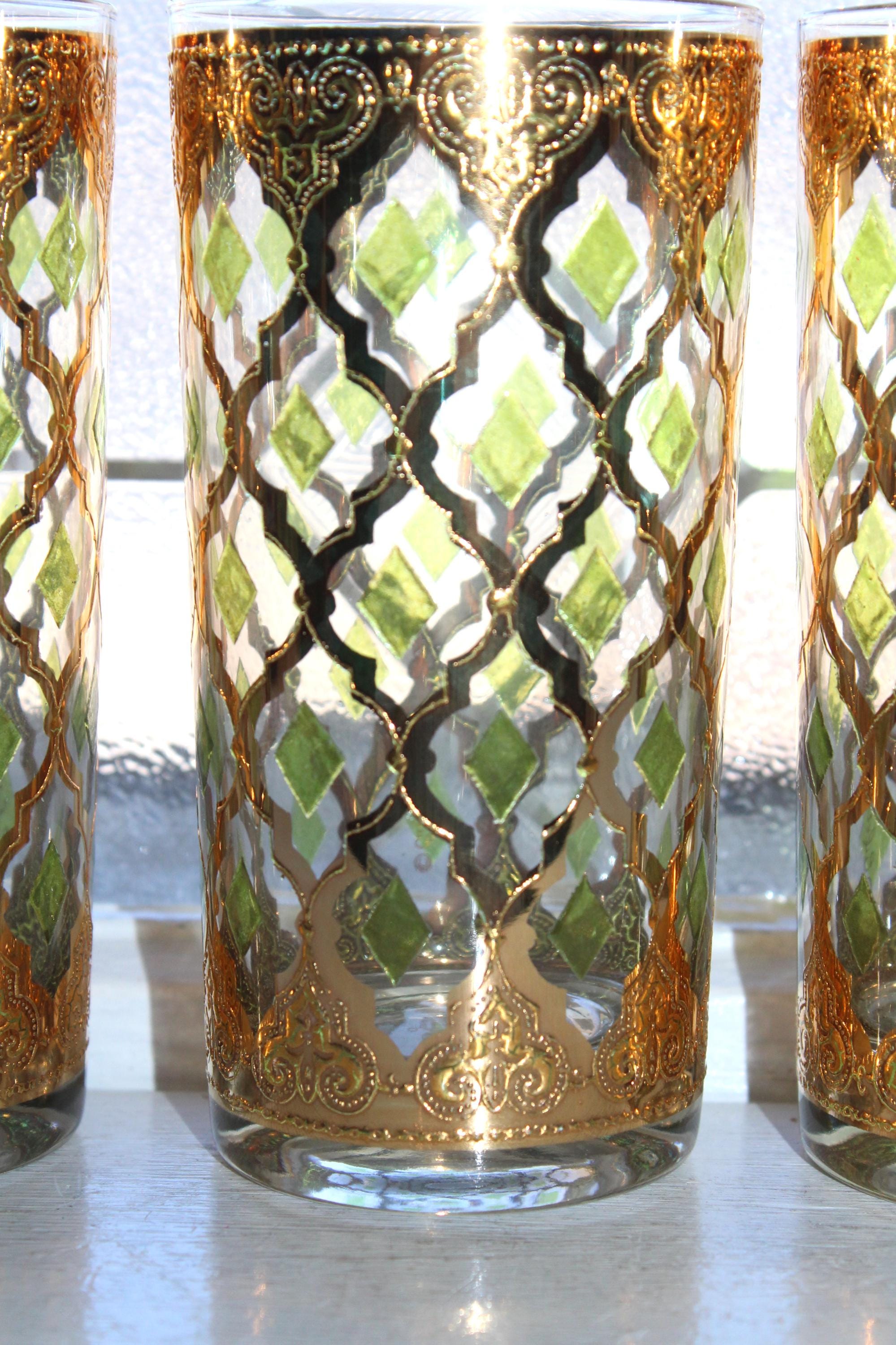 Set of 4 vintage 1960s Mid Century/Hollywood Regency Culver Valencia glass highball tumblers featuring 22k gold and green diamond decoration, in excellent condition.  Each tumbler measures 5 1/2" high and 2 3/4" in diameter at the top.  No chips, cracks or wear, perfect for use or display in a retro home.  THERE ARE 2 SETS OF 4 AVAILABLE VIA THE DROP DOWN BOX.  Enjoy!