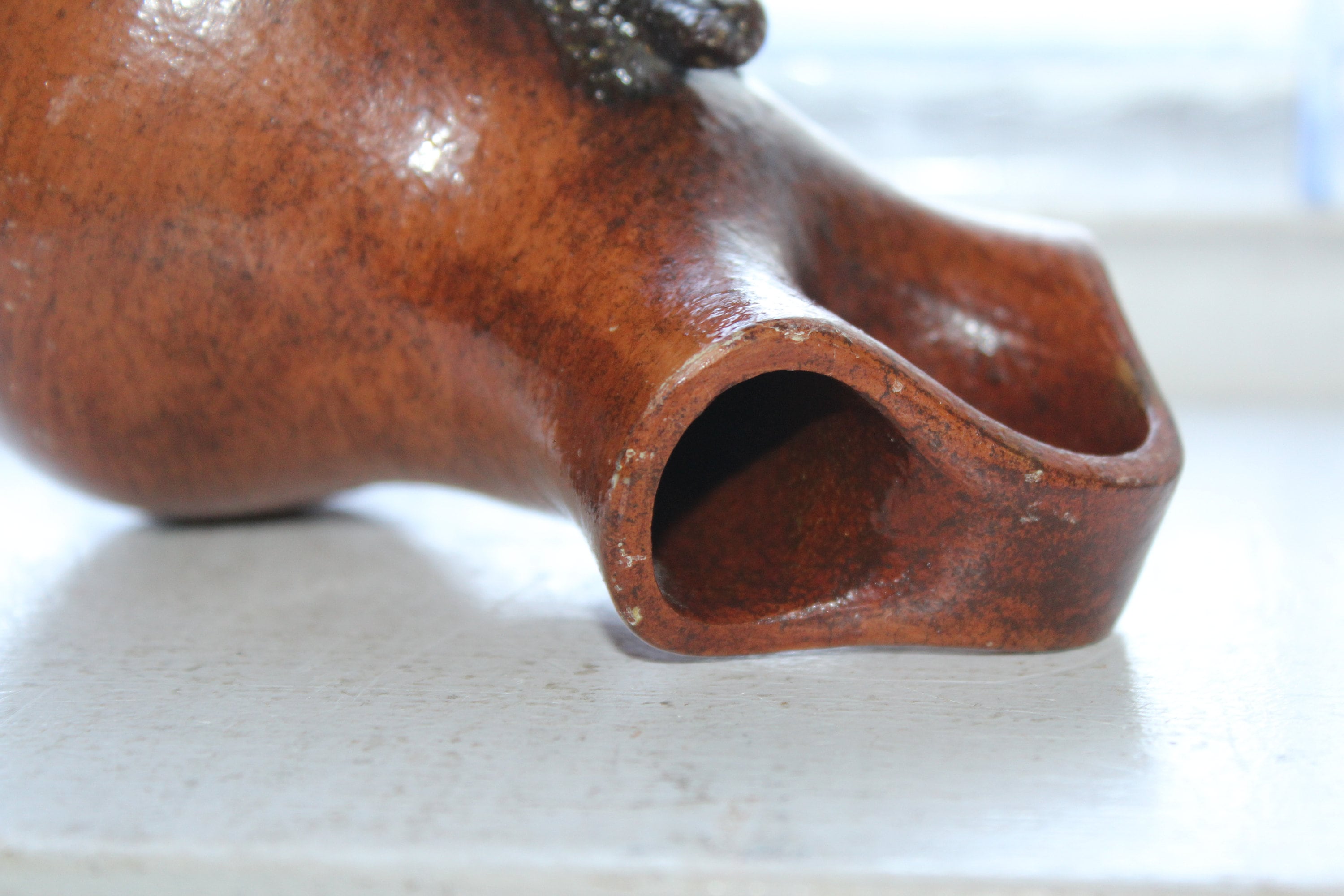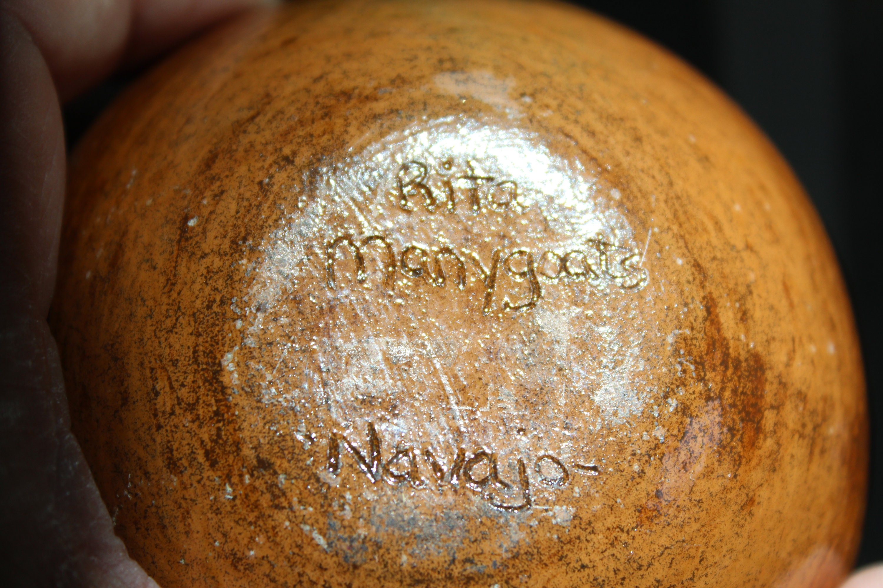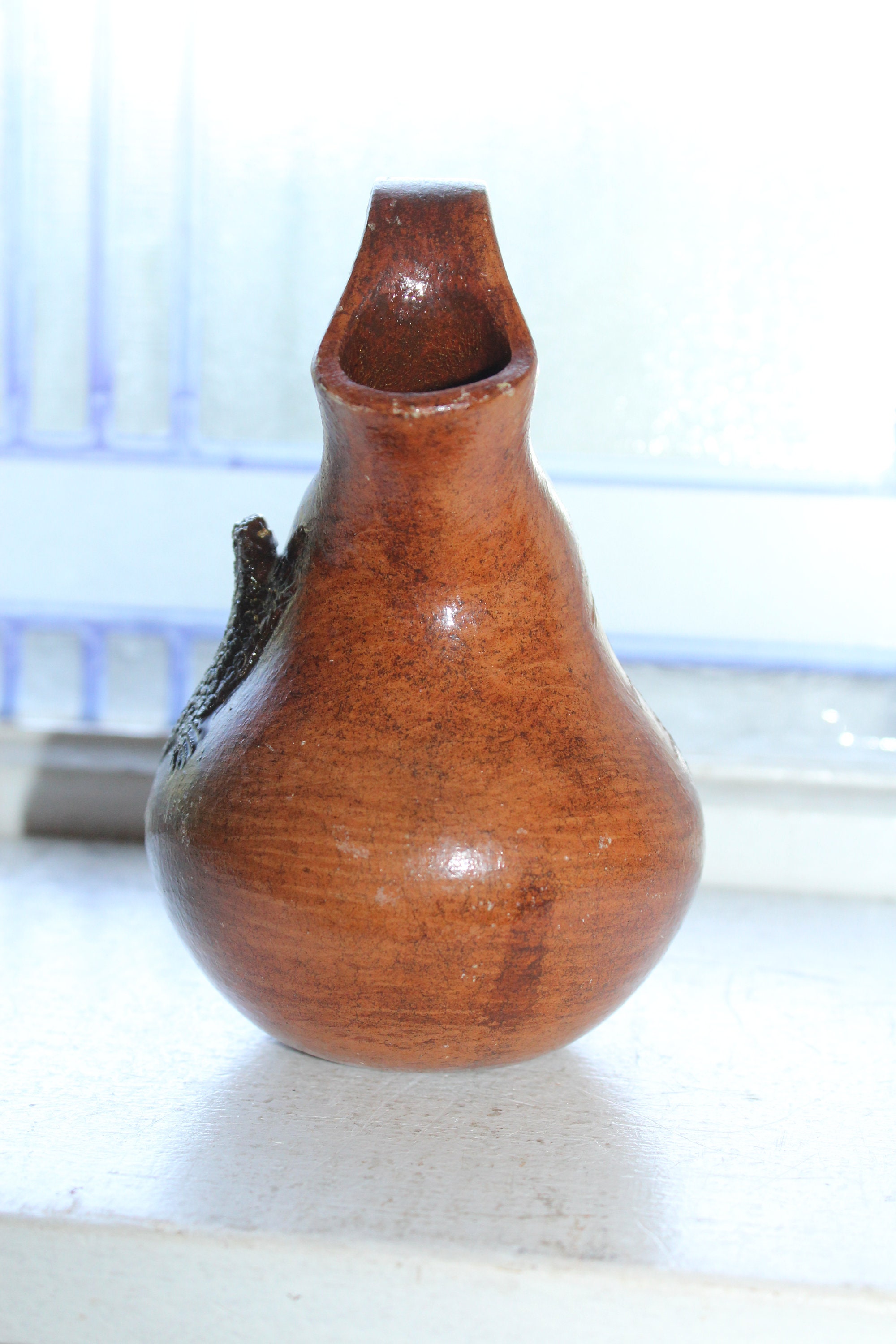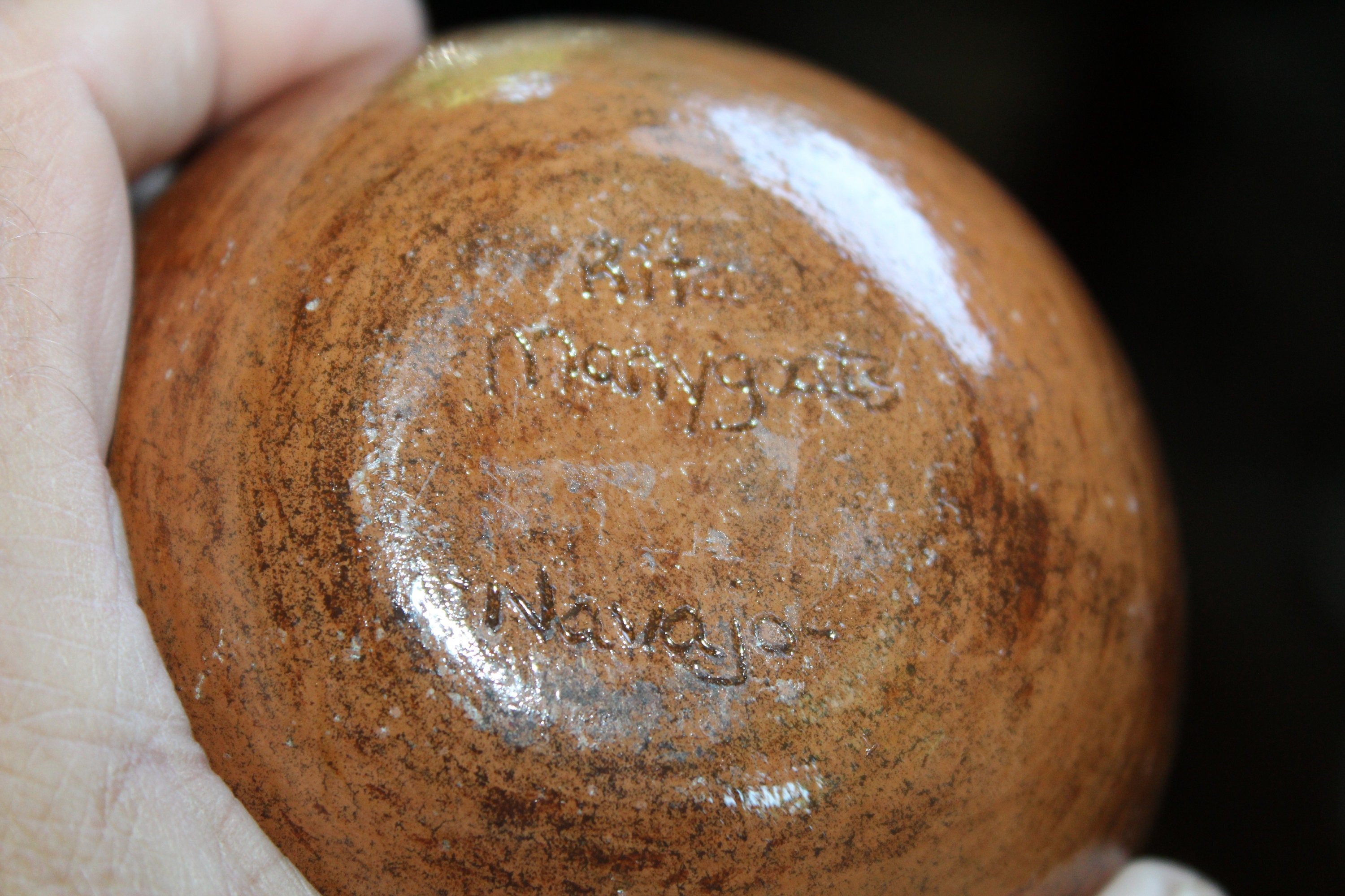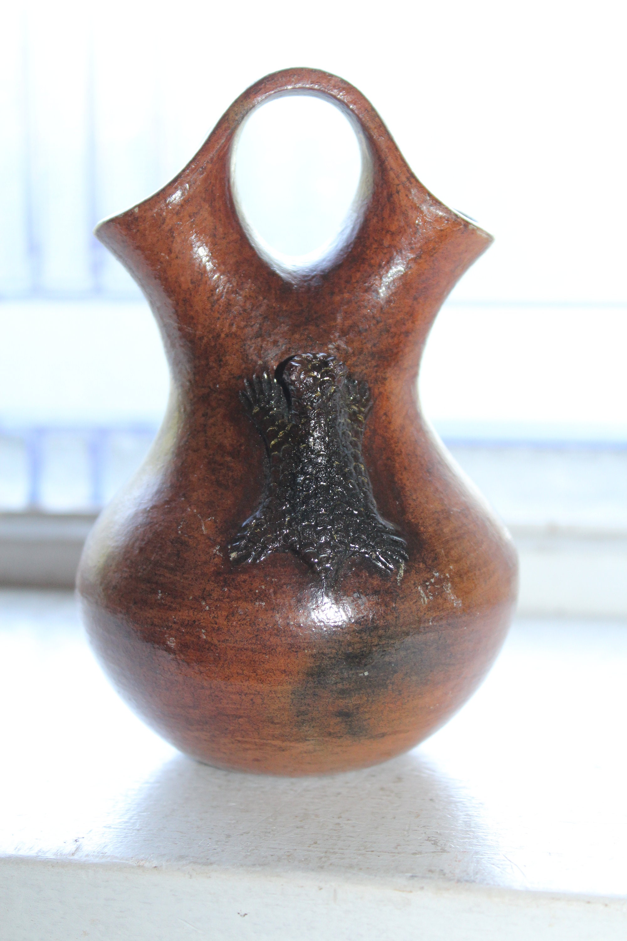 Vintage Navajo pottery redware wedding vase with applied horned toad or lizard, signed by the Native American Artist Rita Manygoats. The vase measures 5 1/2" high. No chips or cracks other than some small glaze chips to the rim. Enjoy!