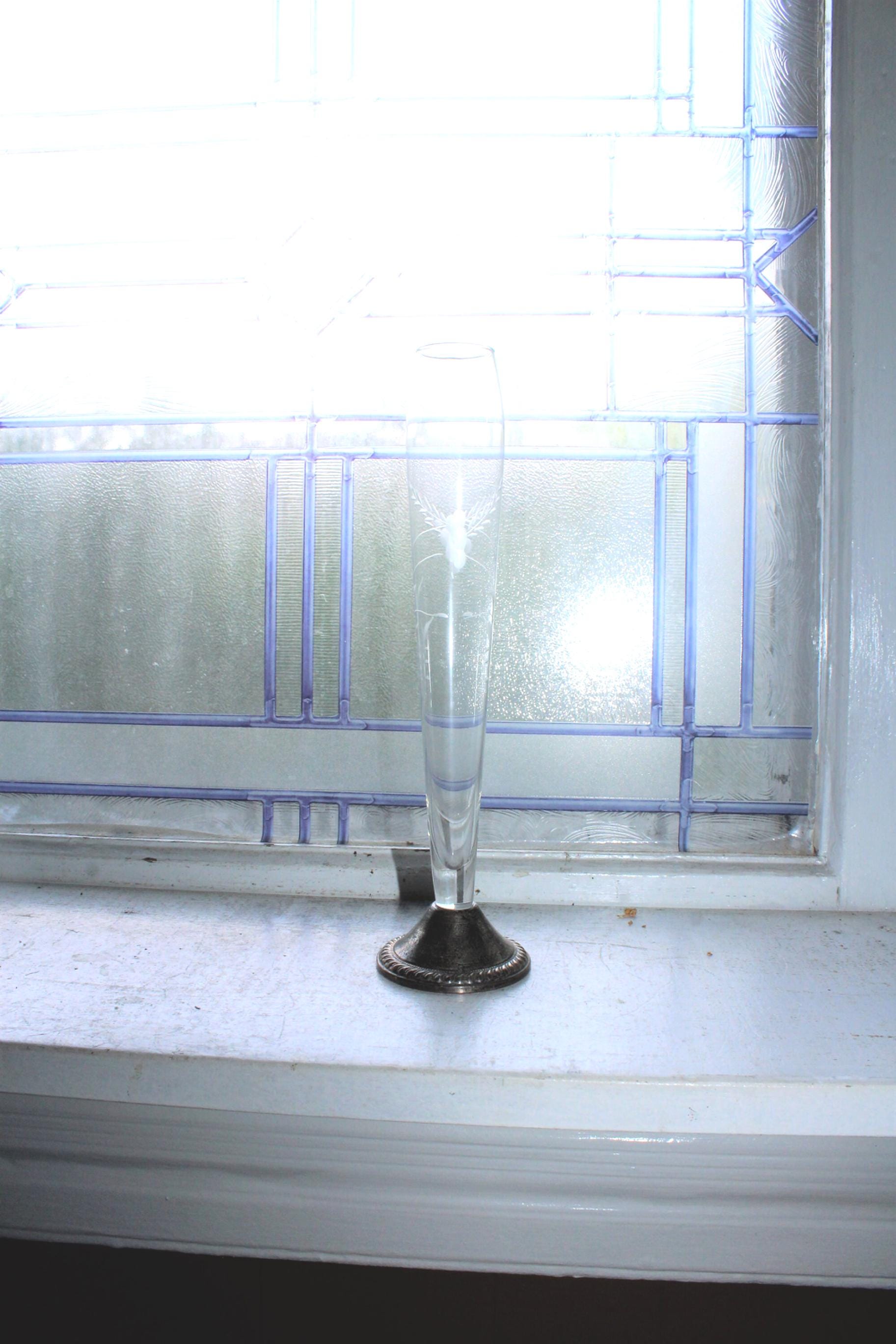 Vintage Duchin Creation sterling silver weighted and etched crystal bud vase, in very good condition. It measures 9 3/4" high x 2 1/2" in diameter at the base. I have not tried to polish the silver base. Enjoy!