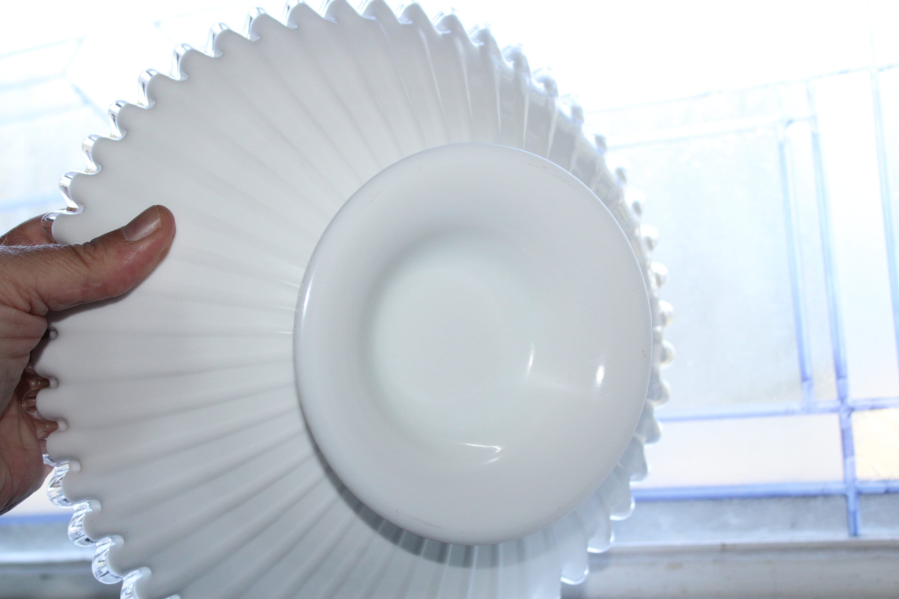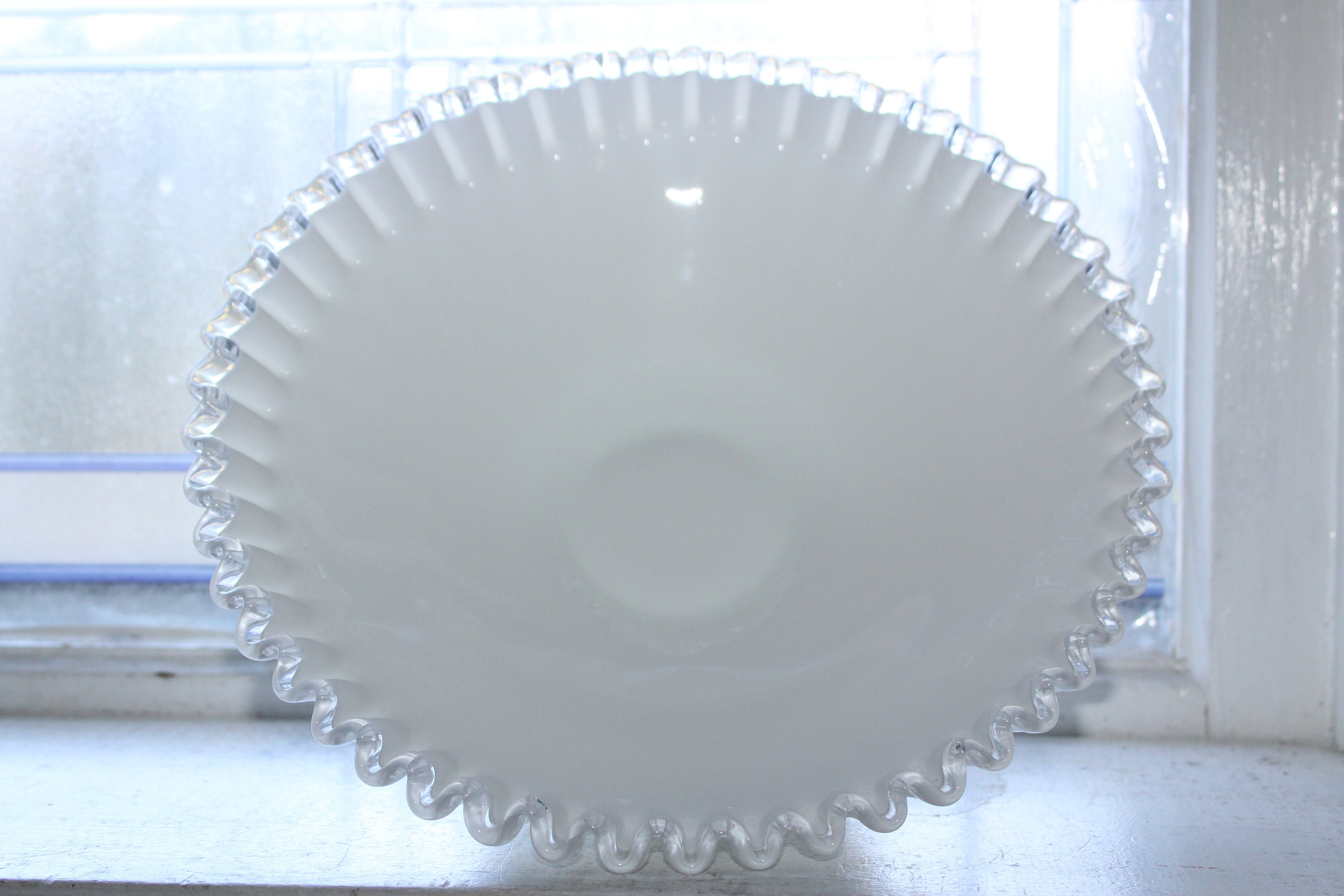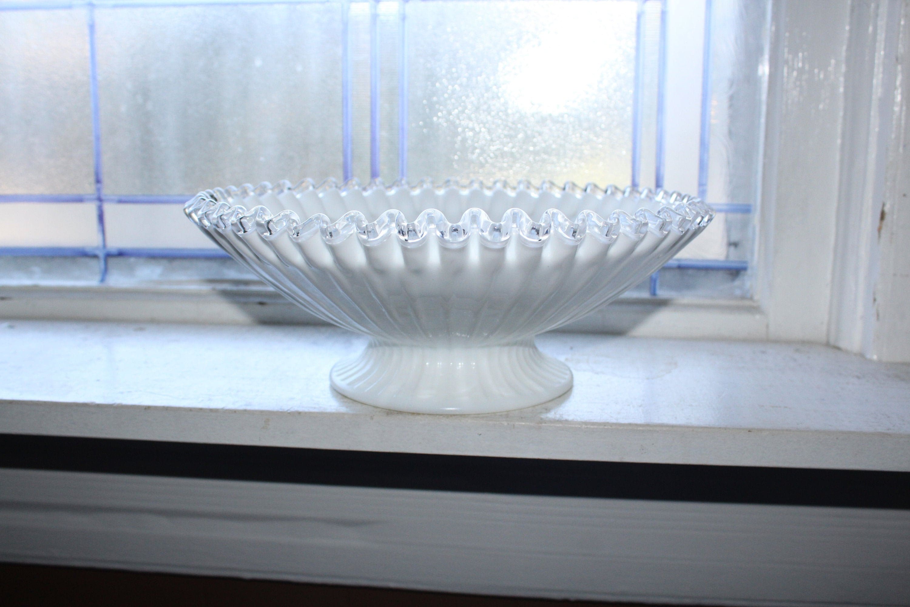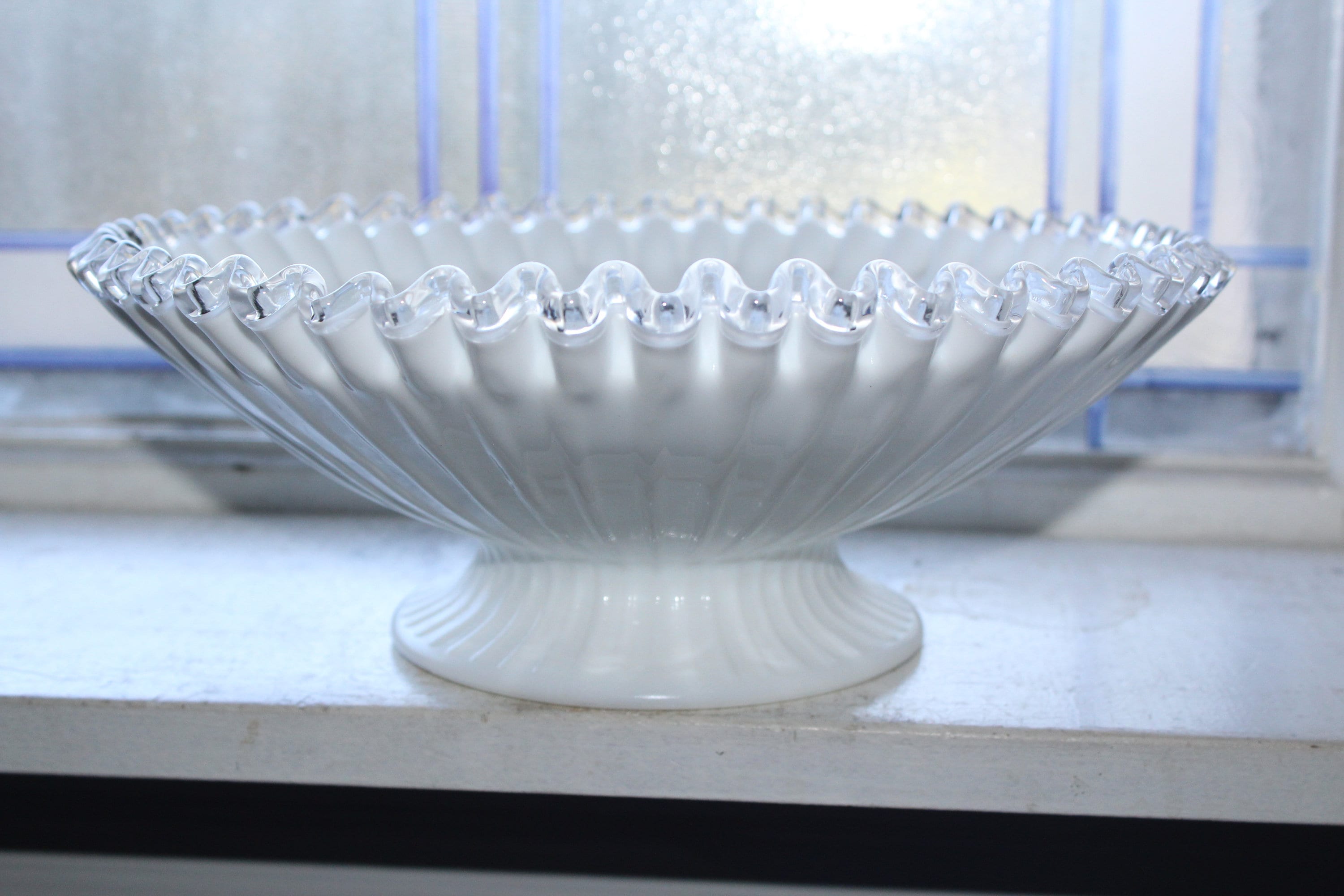 Vintage Fenton glass white Silver Crest large ribbed bowl, in excellent condition. The bowl measures 10 3/4" wide x 4" high. No chips, cracks or wear, perfect for use or display. Enjoy!