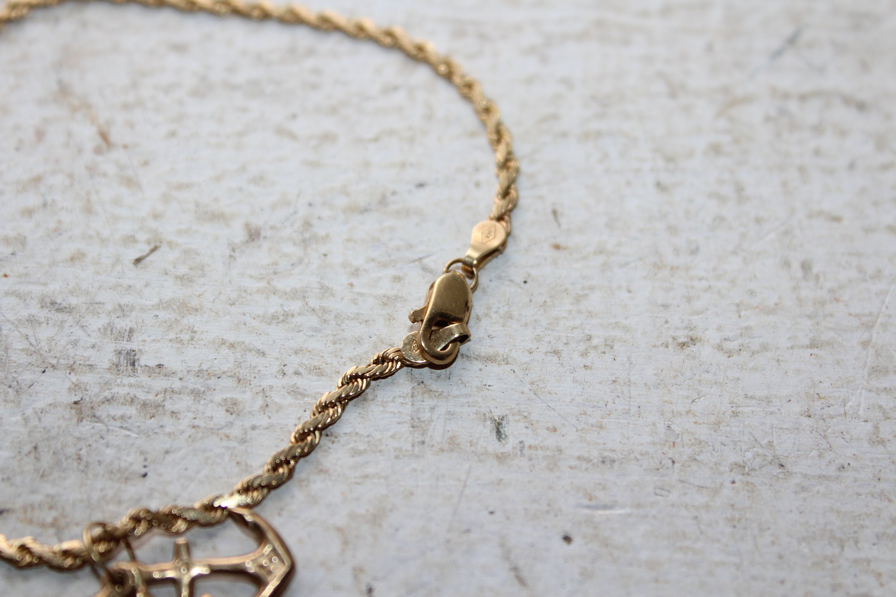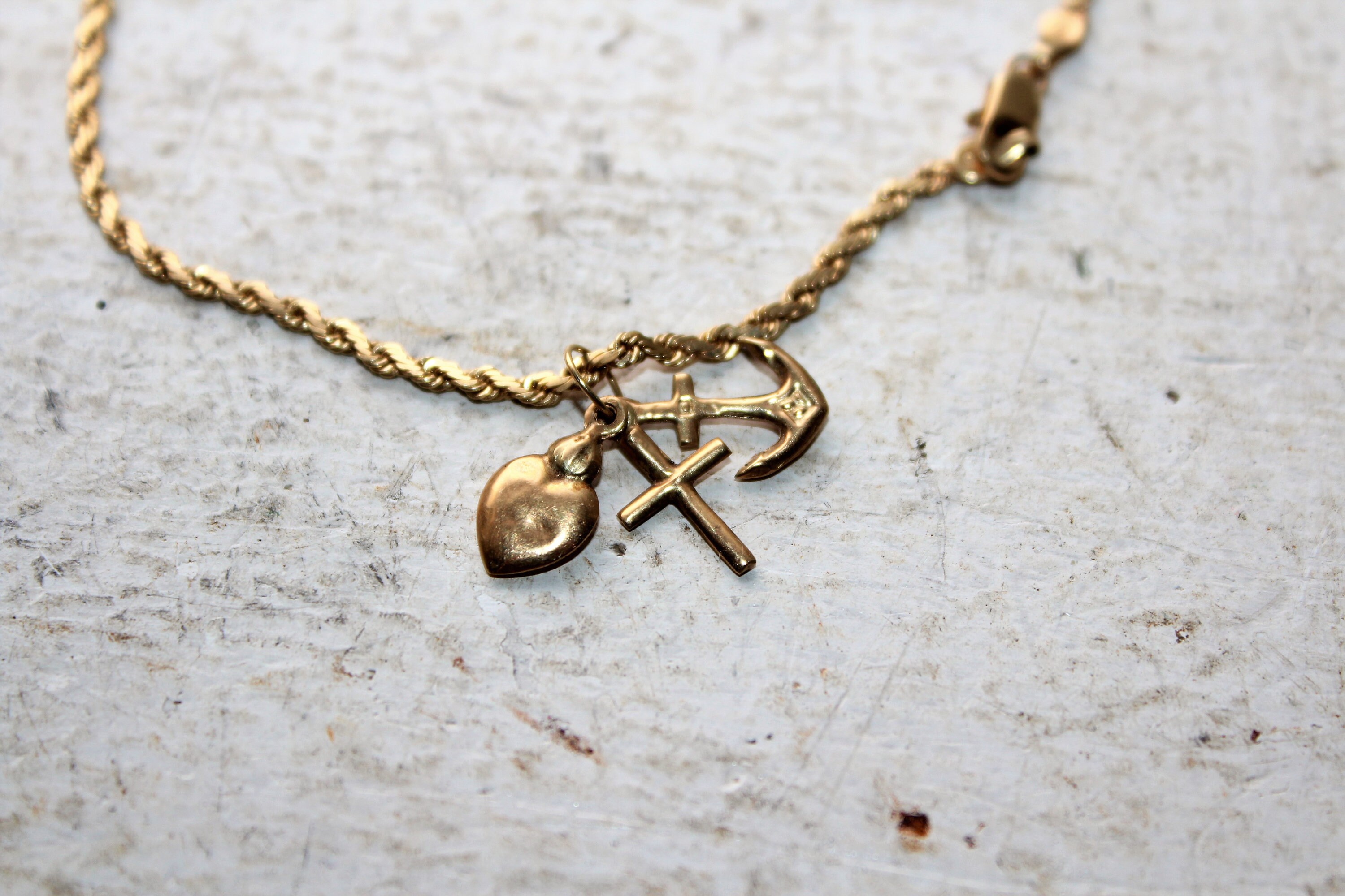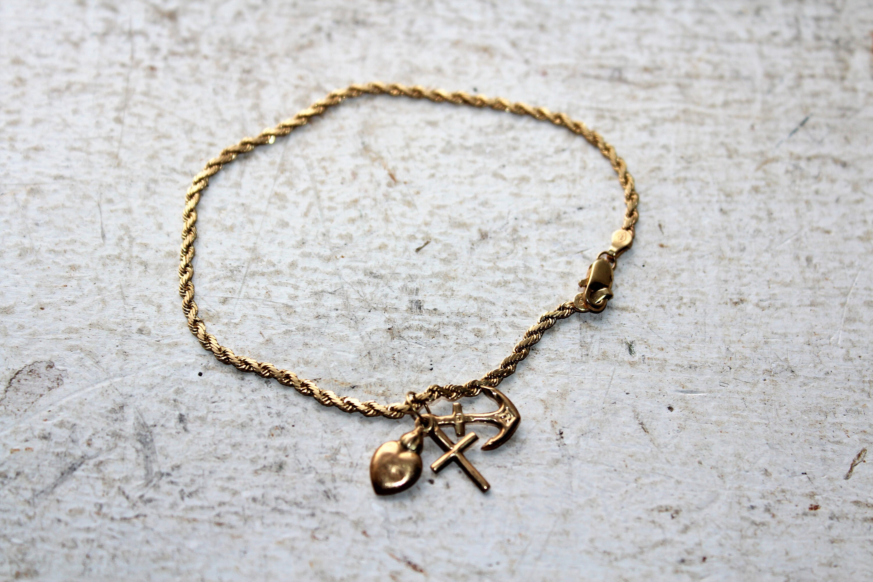 Vintage 14K gold charm bracelet with 3 charms, made by OroAmerica, in excellent condition. It measures 8" long and weighs 6 grams. Charms included are a heart, cross and anchor. Enjoy!
