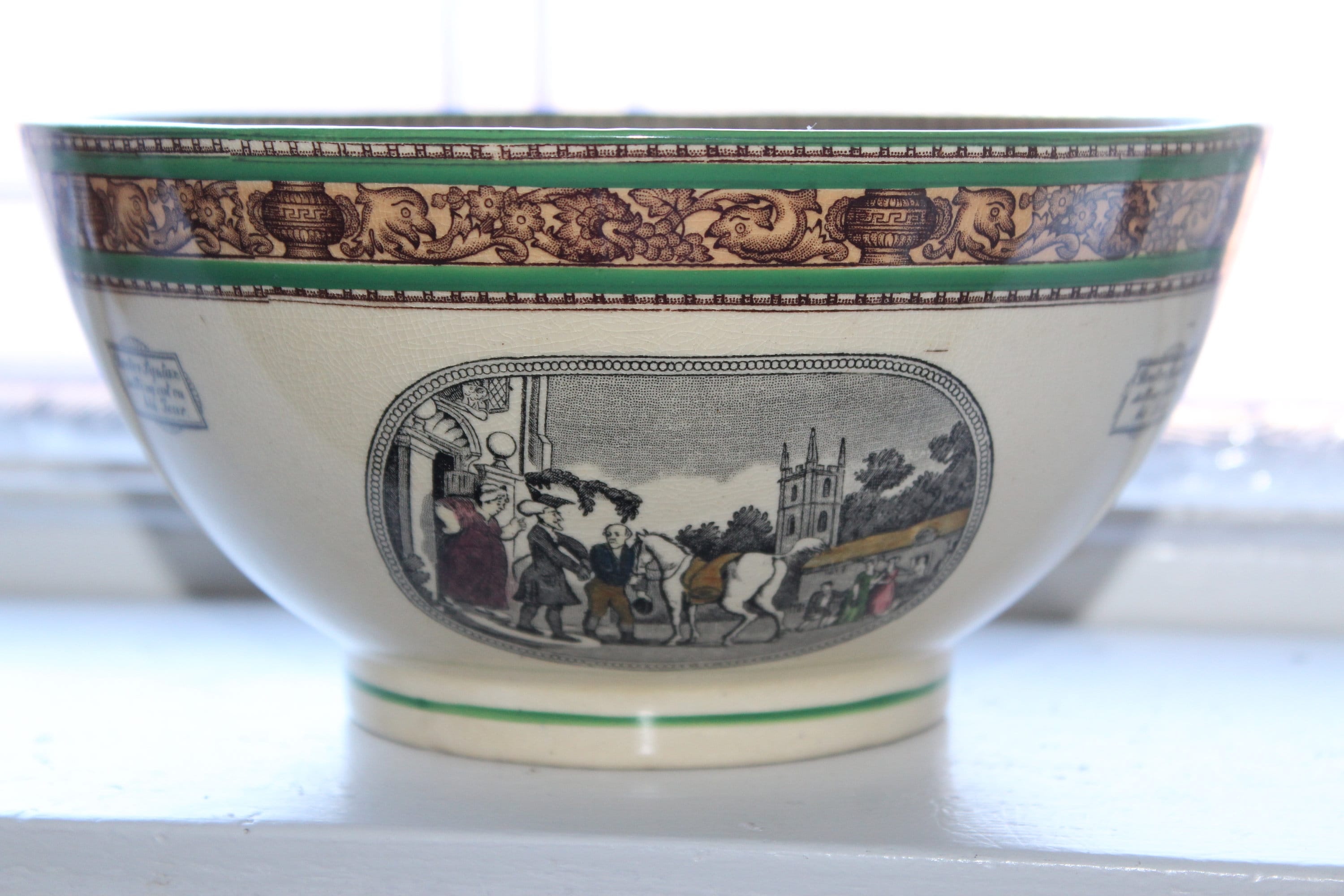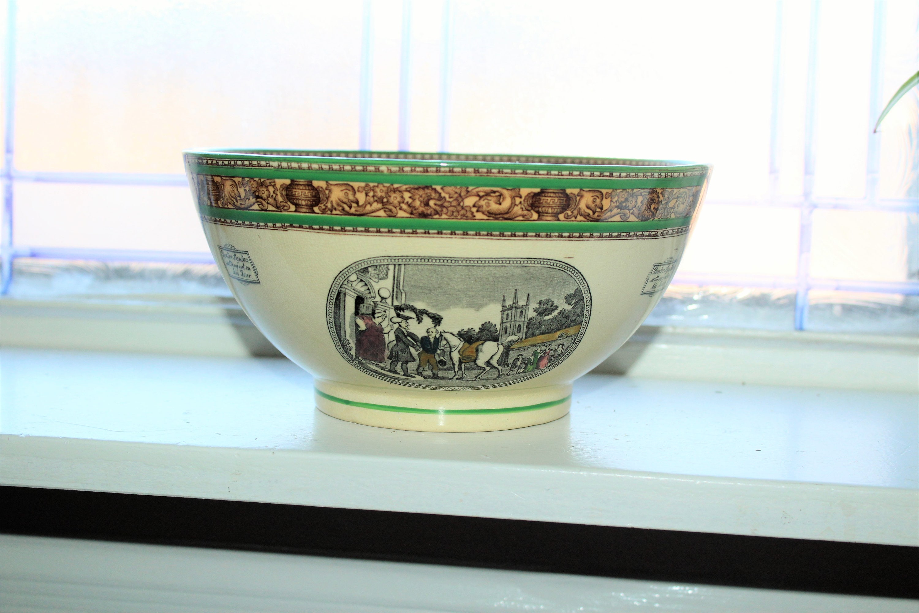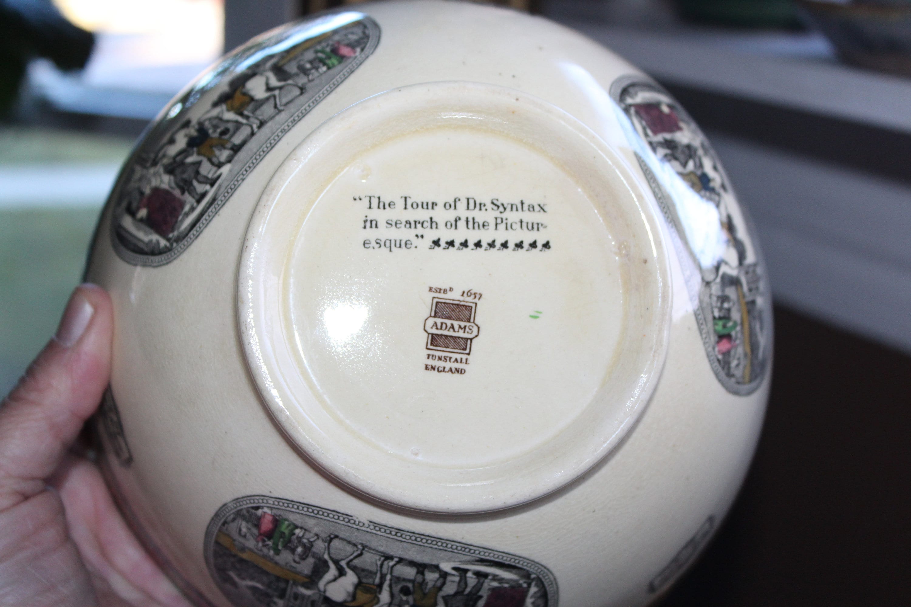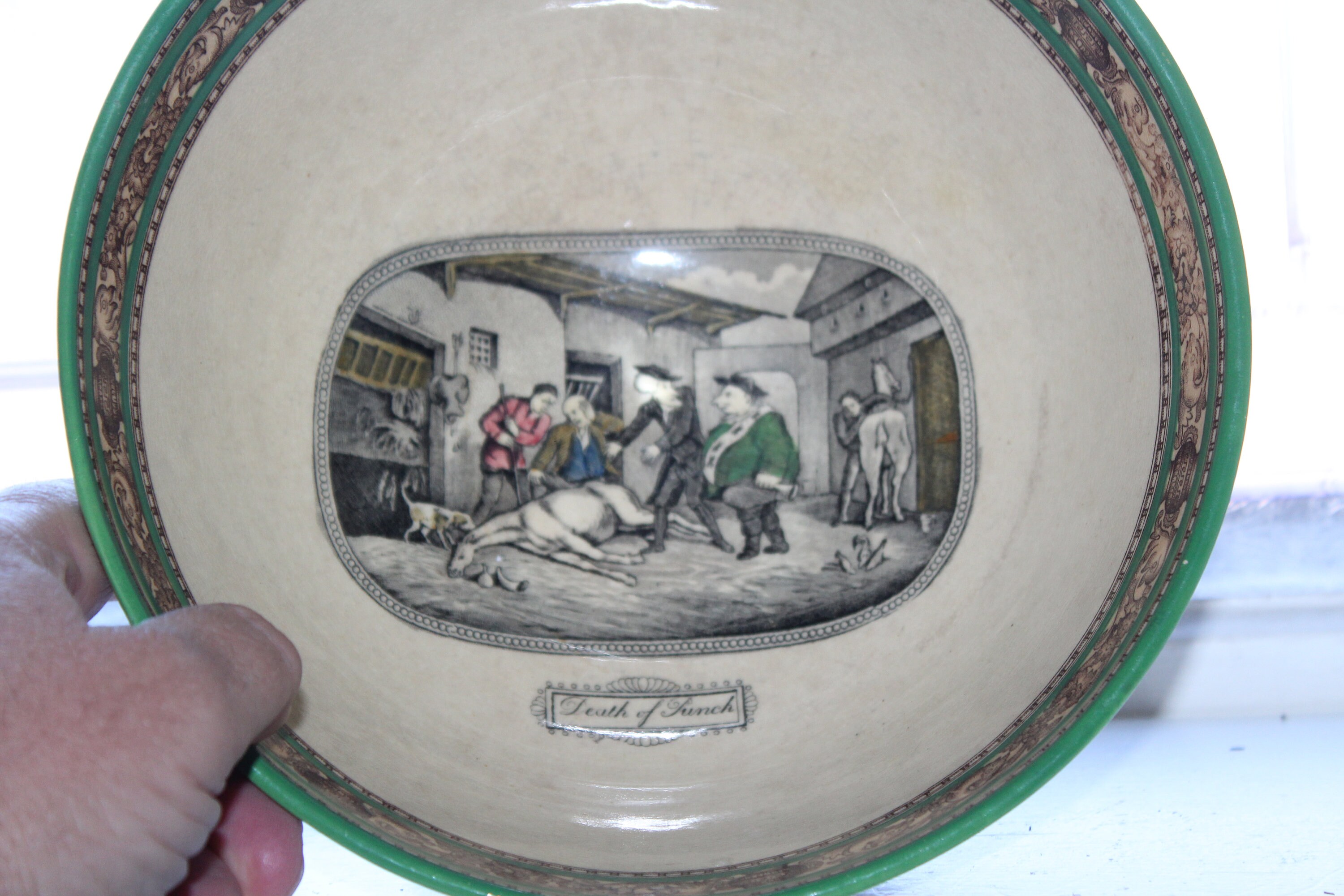 Antique late 1800s Adams Pottery of England ironstone transferware large bowl featuring Dr. Syntax and the Death of Punch, in very good condition. The bowl measures 3 7/8" high x 8" wide and has no chips or cracks, perfect for use or display. Enjoy!