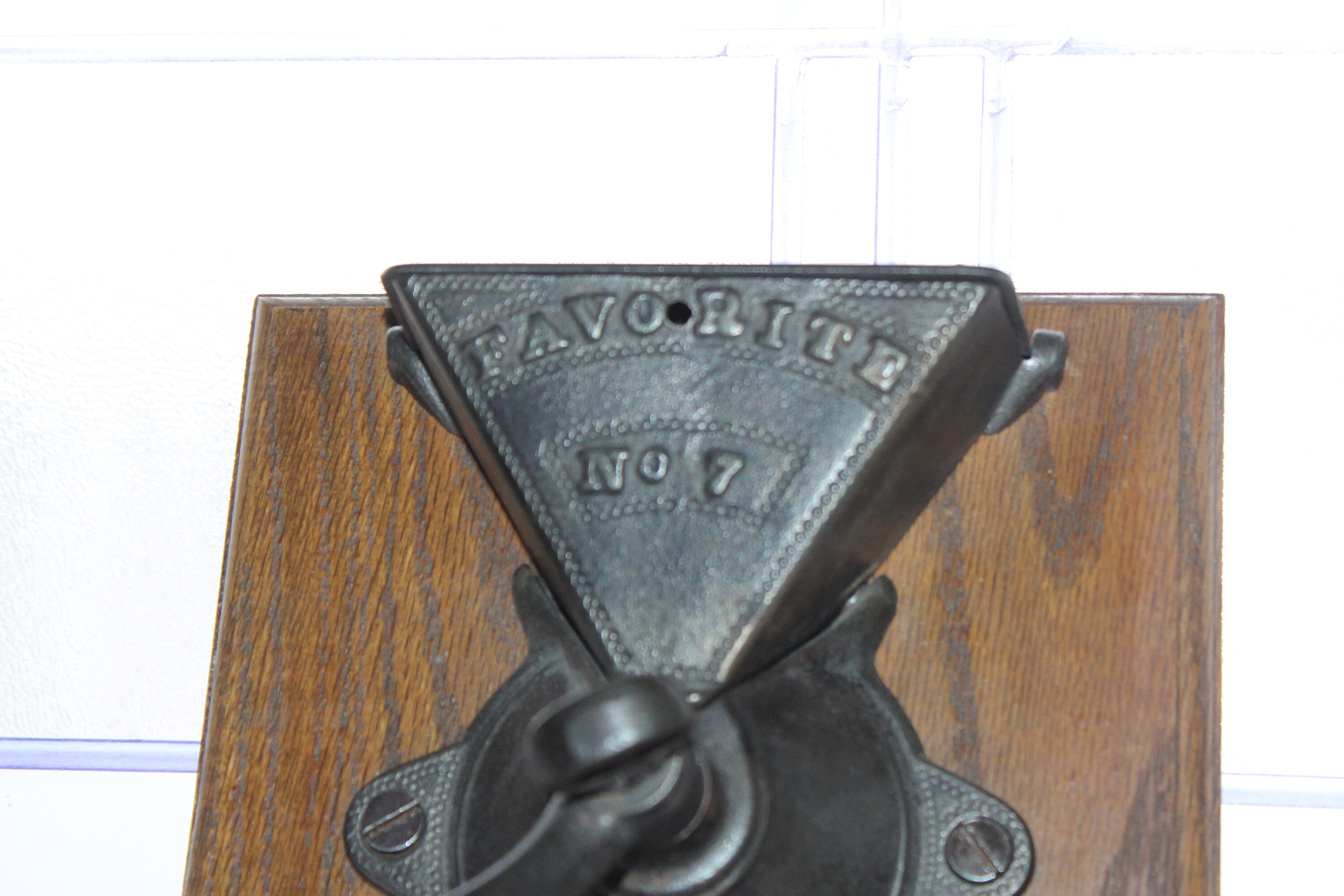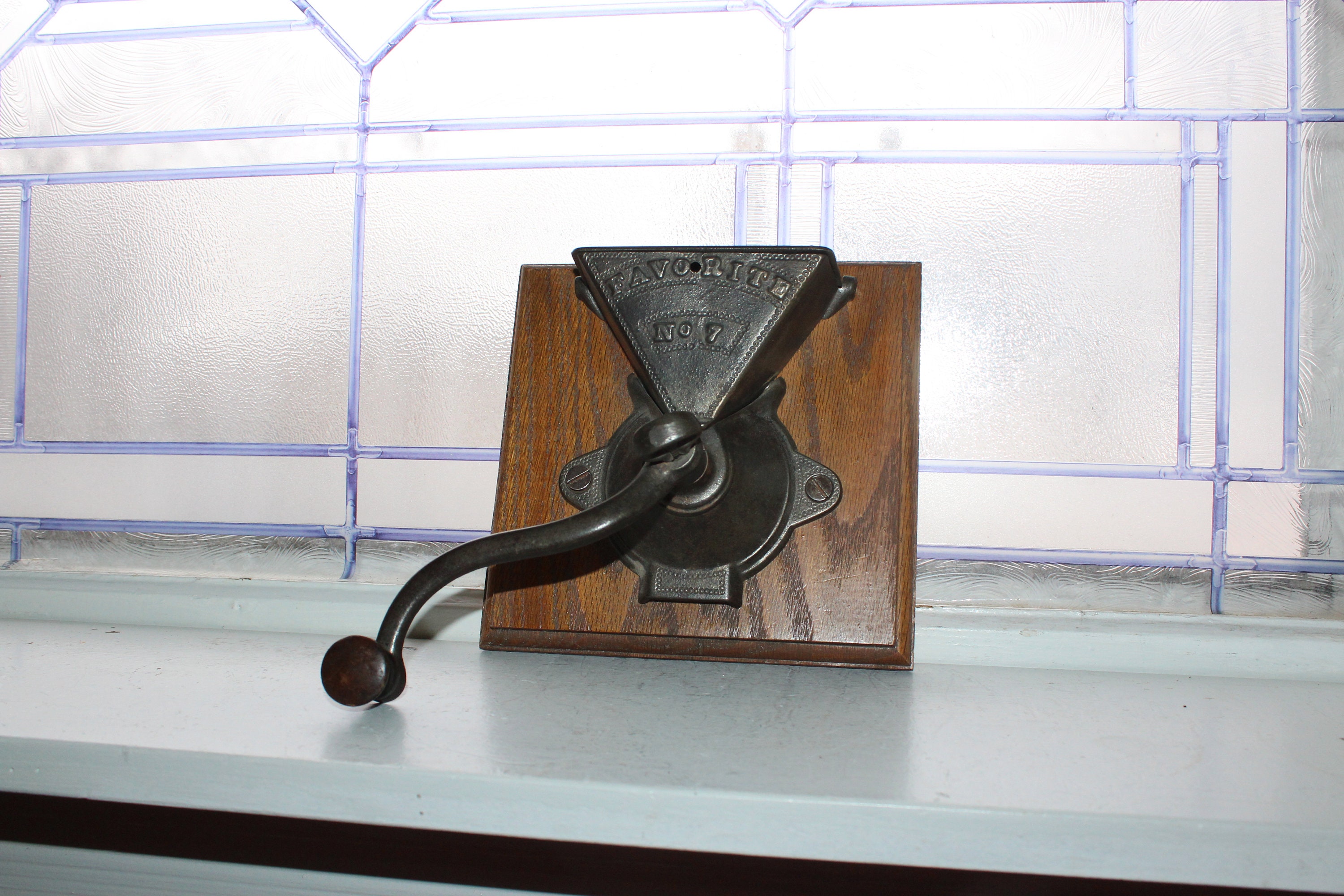 Primitive antique chuck wagon Favorite No. 7 coffee grinder, wall mount, perfect for display in a country kitchen. It's mounted on a board that measures 7" wide x 7" high. The grinder works well and has no damage. Enjoy!