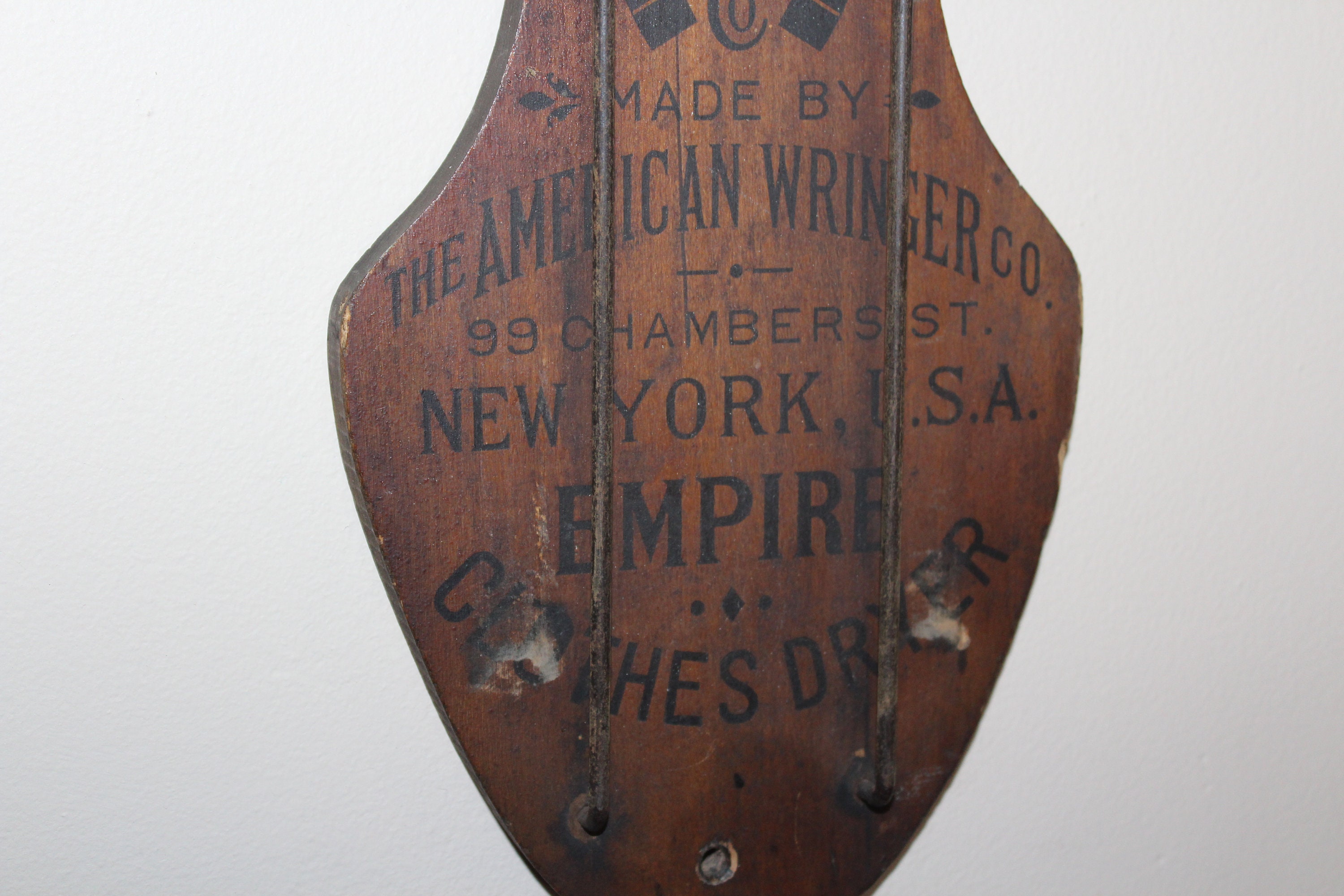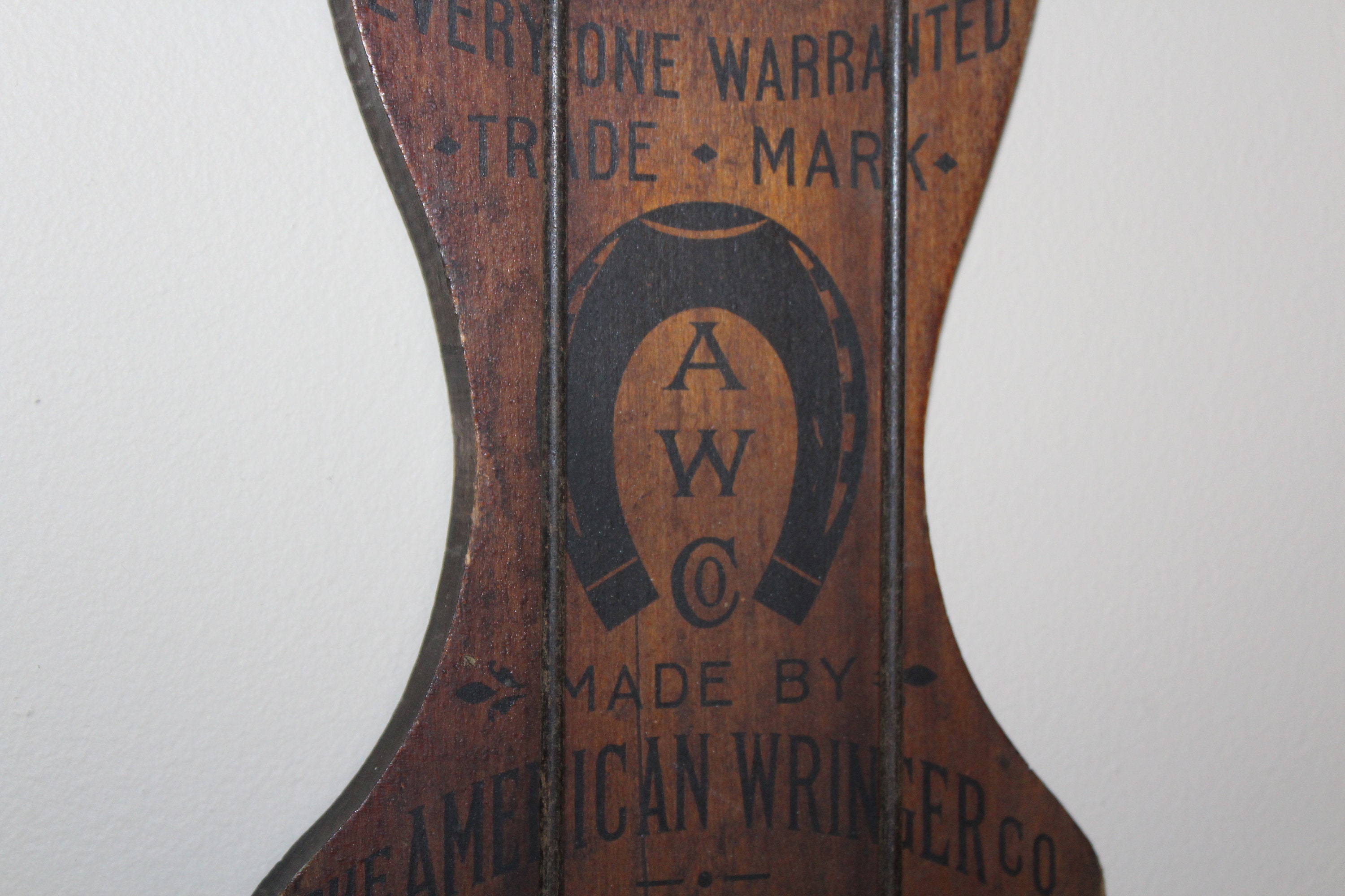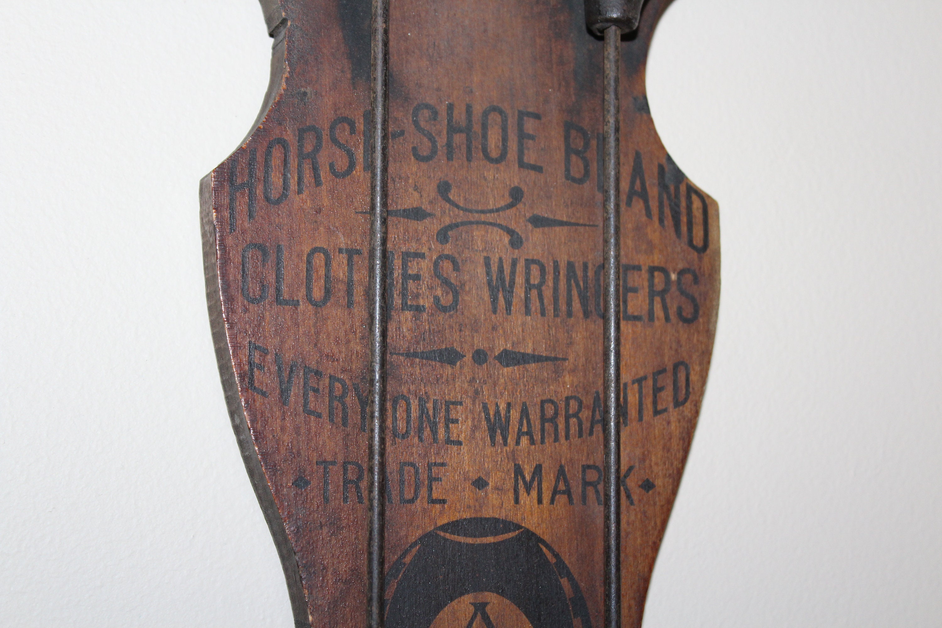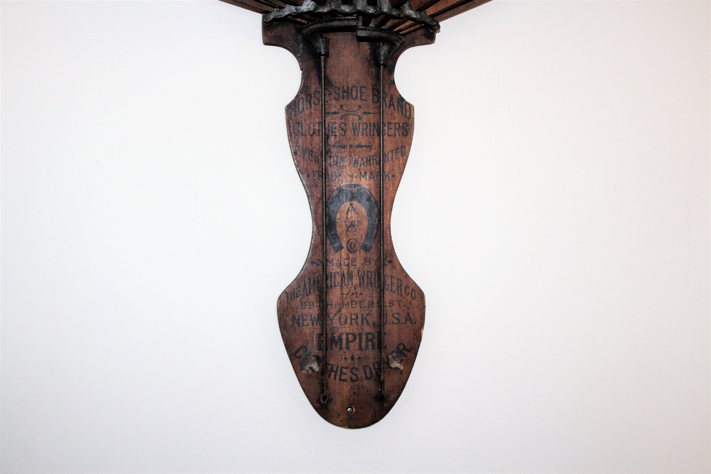 This is a wonderful antique Horse Shoe Brand wooden clothes dryer / hanger, made by the American Wringer Company and perfect for so many uses- drying clothes, towel hanger, dried flowers... Looks great in the laundry room, kitchen, or anywhere in a country home or farmhouse. It measures 25" high when folded and roughly 46" when opened. No damage, great old patina- enjoy! Please note, the shipping cost applies only the the lower 48 continental United States.