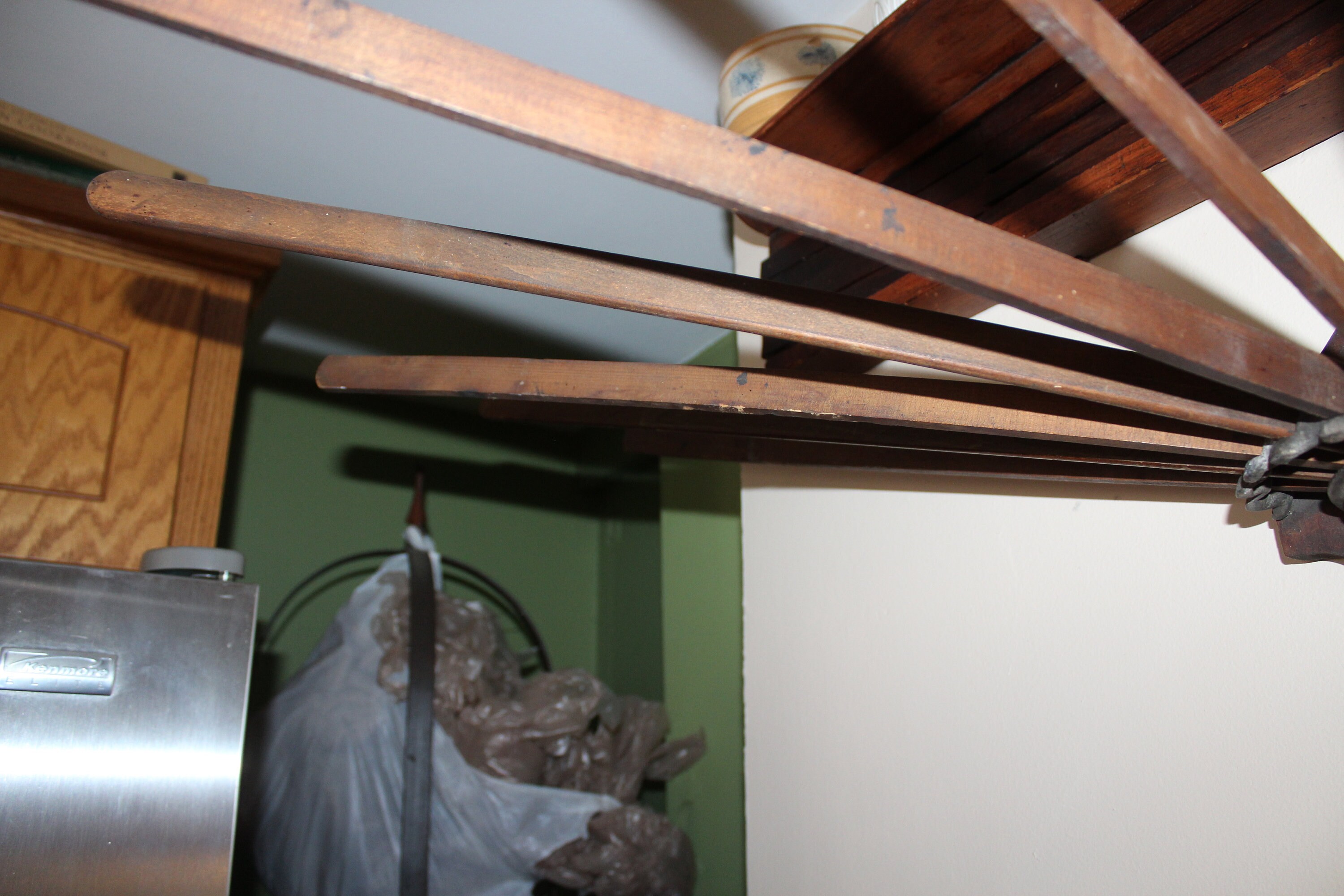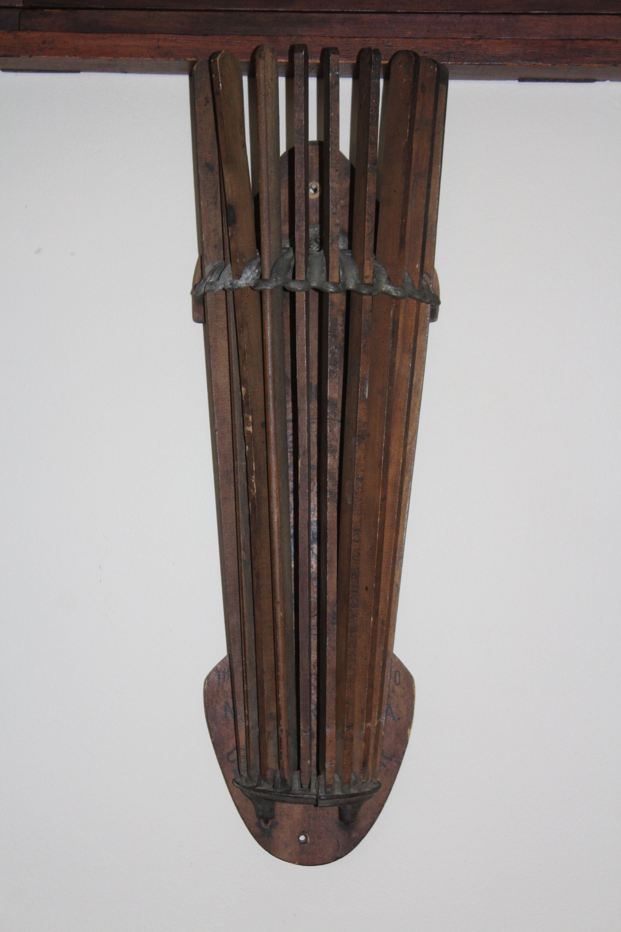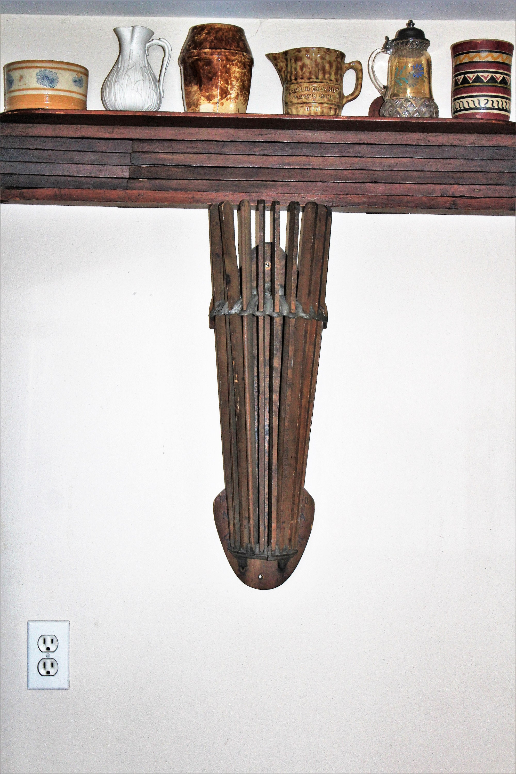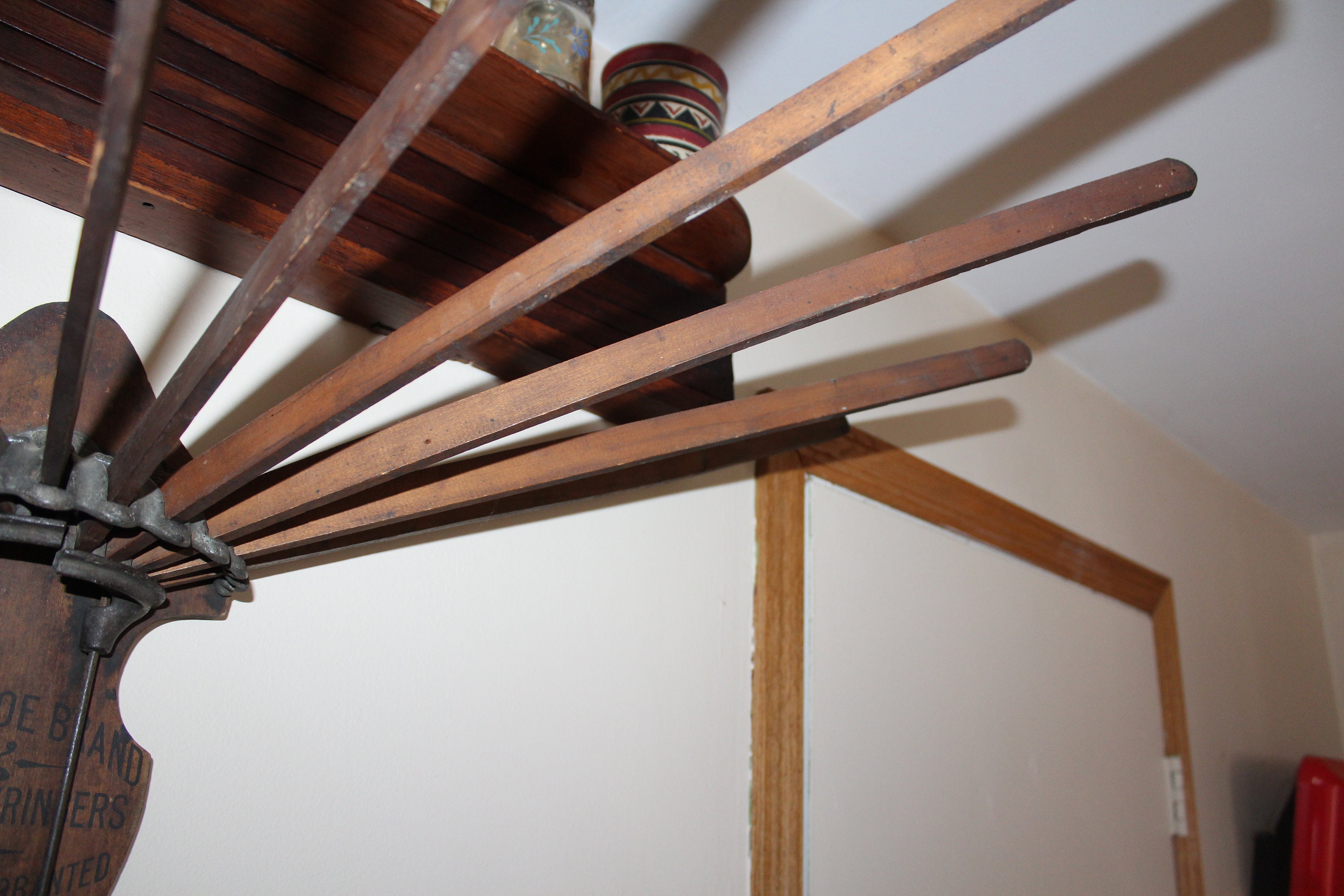 This is a wonderful antique Horse Shoe Brand wooden clothes dryer / hanger, made by the American Wringer Company and perfect for so many uses- drying clothes, towel hanger, dried flowers... Looks great in the laundry room, kitchen, or anywhere in a country home or farmhouse. It measures 25" high when folded and roughly 46" when opened. No damage, great old patina- enjoy! Please note, the shipping cost applies only the the lower 48 continental United States.
